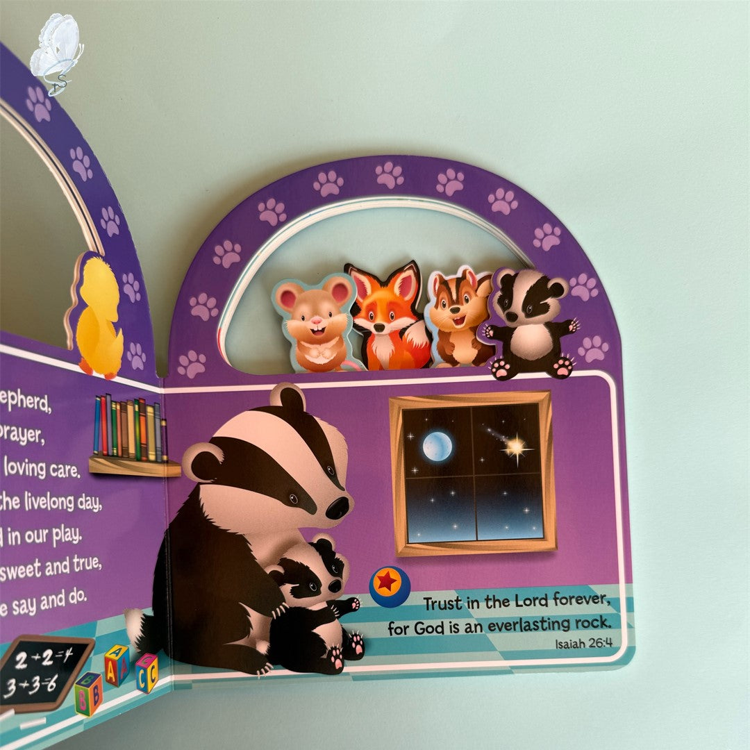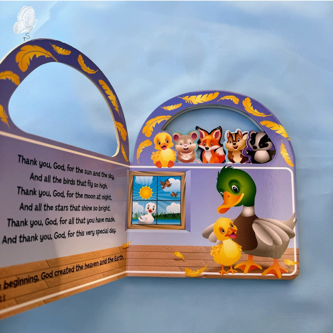 A very cute board book with a charming collection of soothing rhymes and adorable illustrations, encompassing goodnight blessings and thank-you prayers. Its unique carry-along handle allows children to take their favorite prayers wherever they go, making it perfect for bedtime at home or on the move. The book's gentle words aim to fill young hearts with love and light, providing comfort and inspiration as they wind down after a busy day. Each prayer is accompanied by a matching Bible verse.