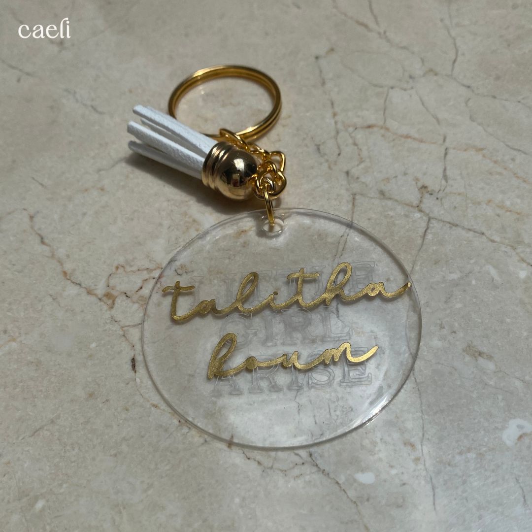 Included: 1 transparent acrylic keyring with white tassel and key chain