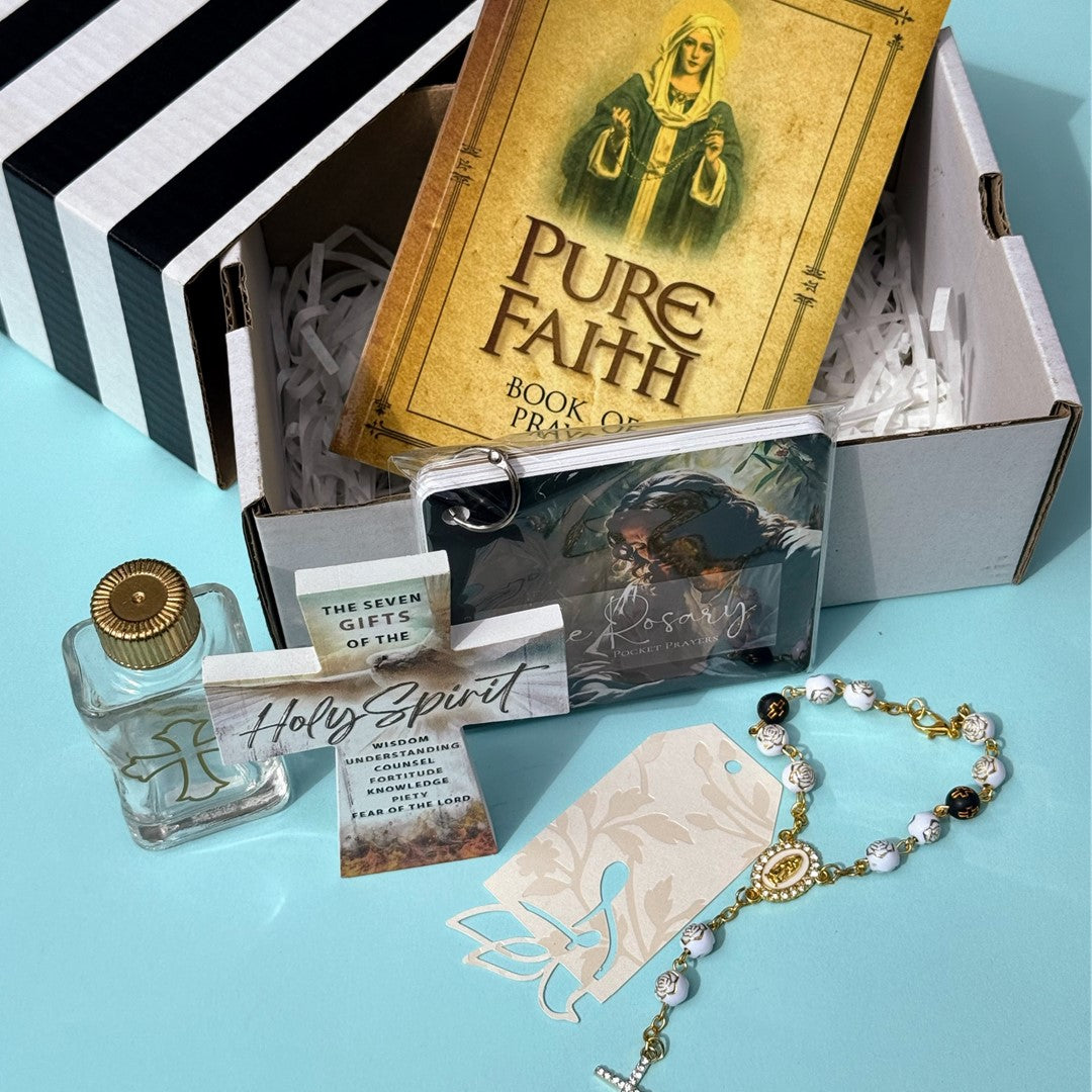 - Includes a Pure Faith book, Rosary pocket prayers, holy water bottle, freestanding cross, and choice of decade rosary or small crucifix