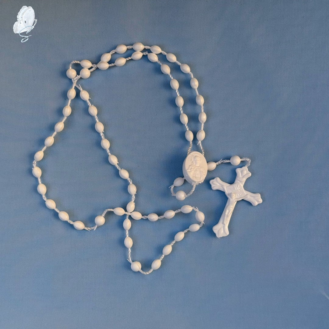 - Full-size white plastic rosary — lightweight, durable, and practical