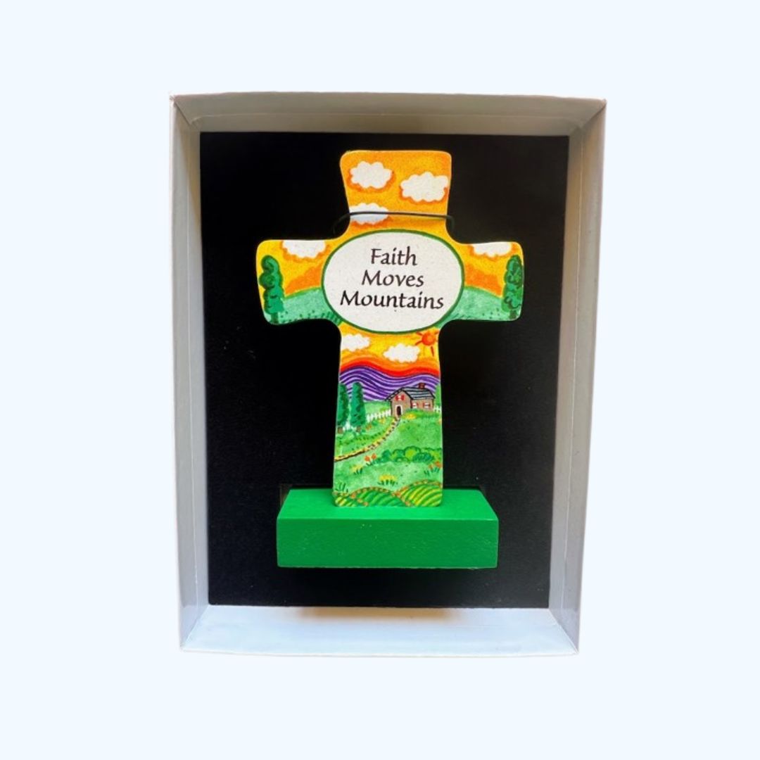 This Faith Moves Mountains cross is painted with a beautiful image and measures 1cm thick, 6.5cm wide x 10cm high. It is free-standing. It comes neatly packaged in a white gift box with black felt, making it a great gift option.