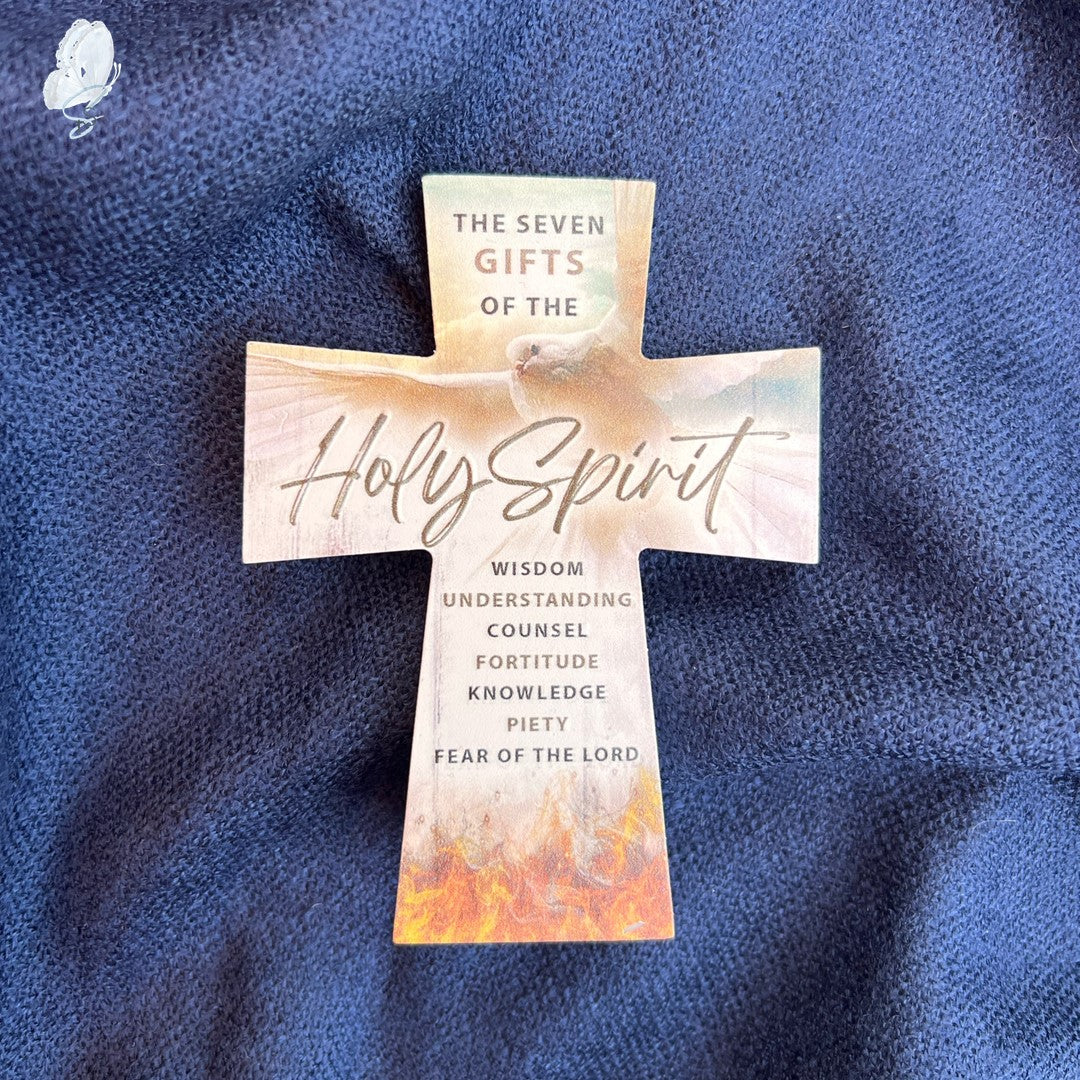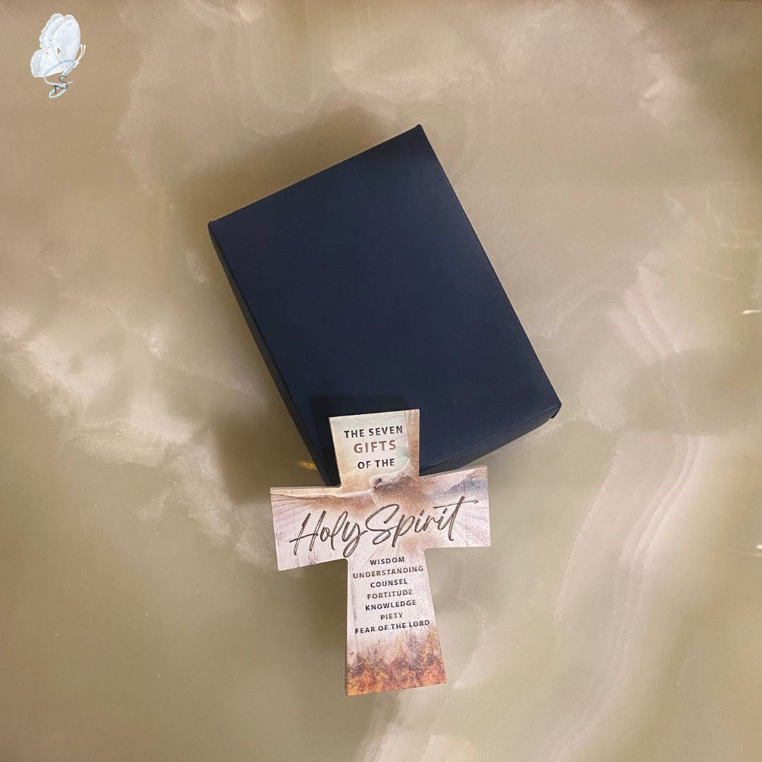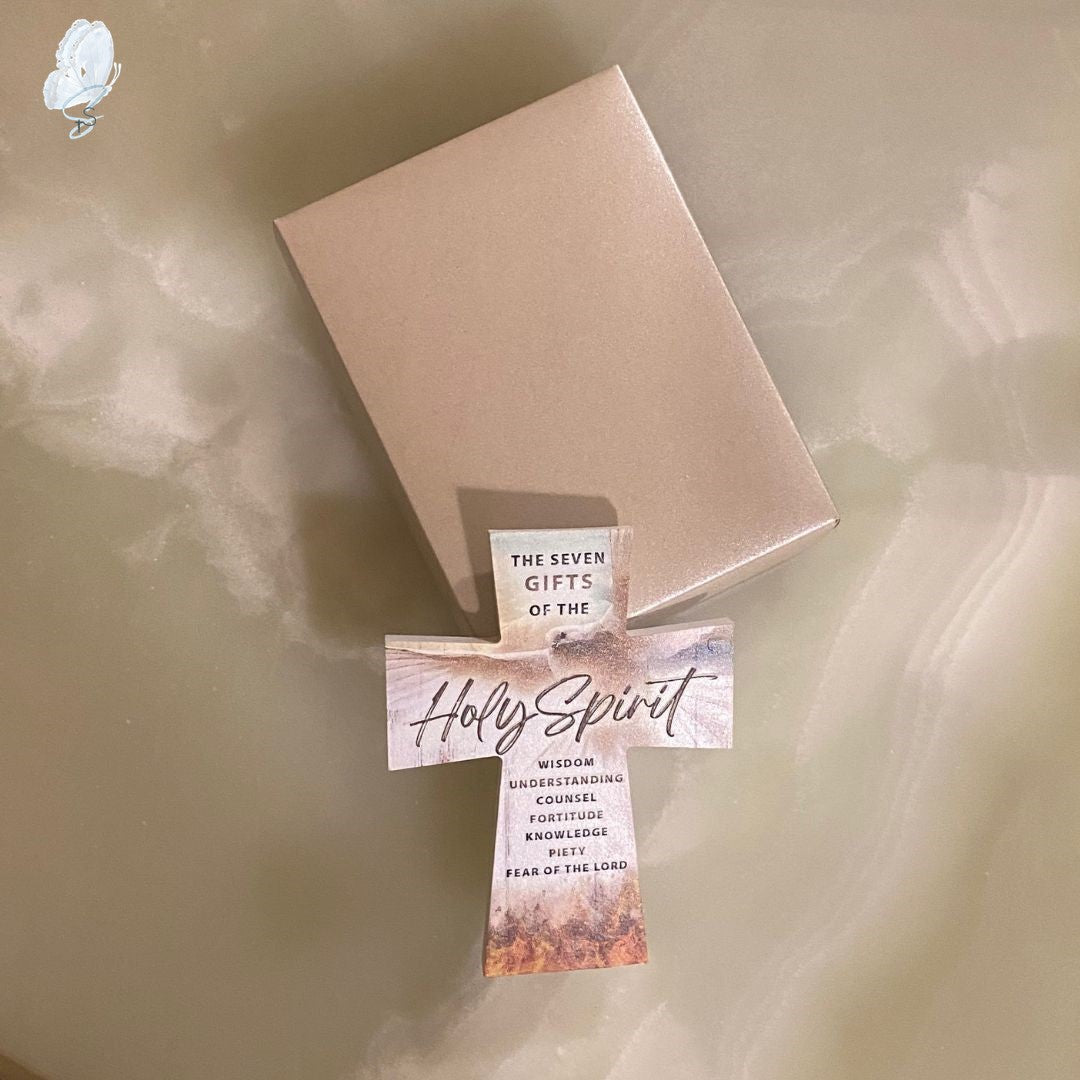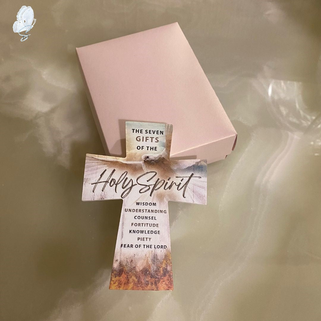 The cross lists the seven gifts of the Holy Spirit - wisdom, understanding, counsel, fortitude, knowledge, piety, and fear of the Lord - making it especially meaningful for those deepening their faith through the sacraments. Its compact, freestanding design makes it ideal for placing on a bedside table, prayer corner, or shelf.