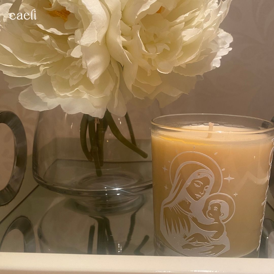 - Mama Mary Candle - Peach-coloured wax in a clear glass jar, infused with the calming scent of sandalwood. Features a serene image of Mary and Baby Jesus with the verse “Arise, shine, for your light has come” (Isaiah 60:1), bringing warmth and prayerful presence into baby's room.