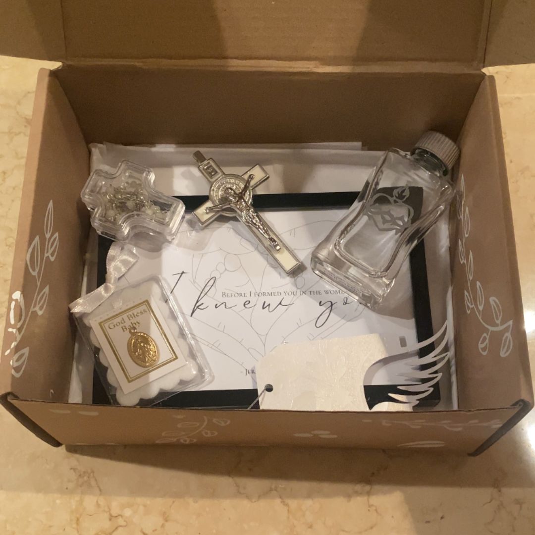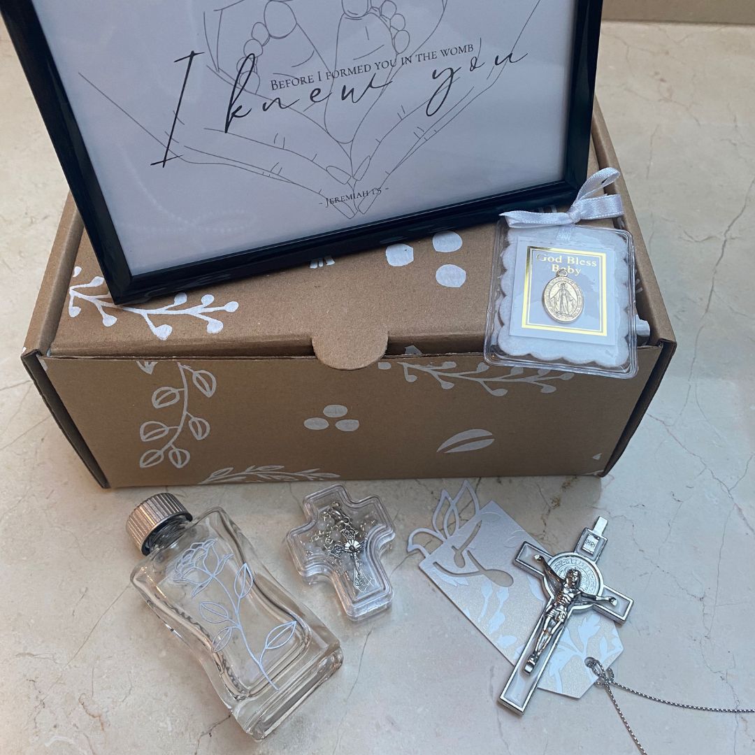 - Includes a holy water bottle, crucifix, medal, rosary, and framed Scripture print