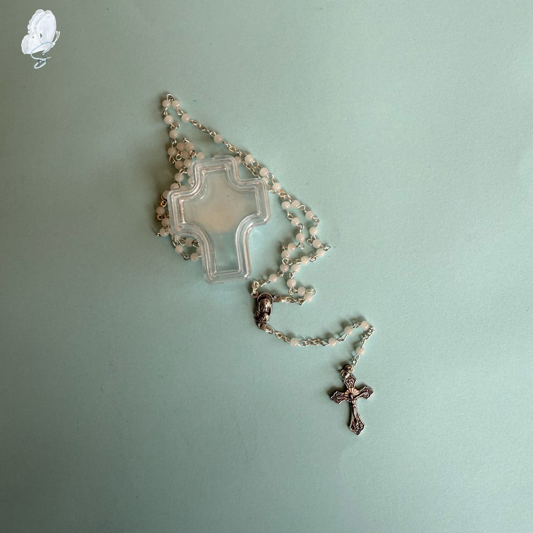 - Tiny White Rosary in a Crucifix-Shaped Container – A precious, child-sized rosary stored in a clear perspex container shaped like a crucifix—ideal for treasuring a first rosary.