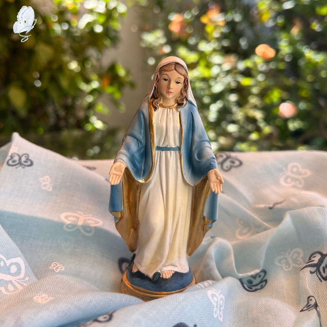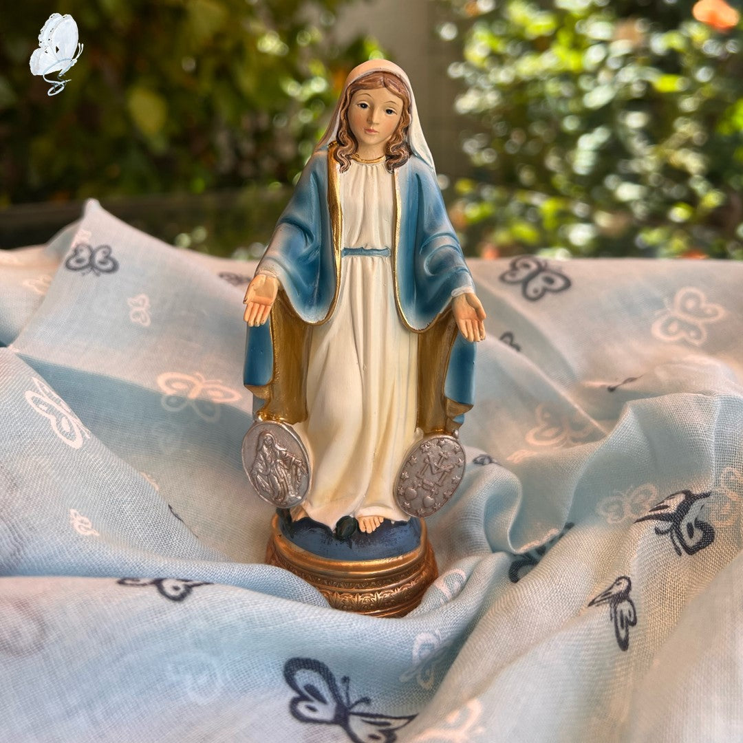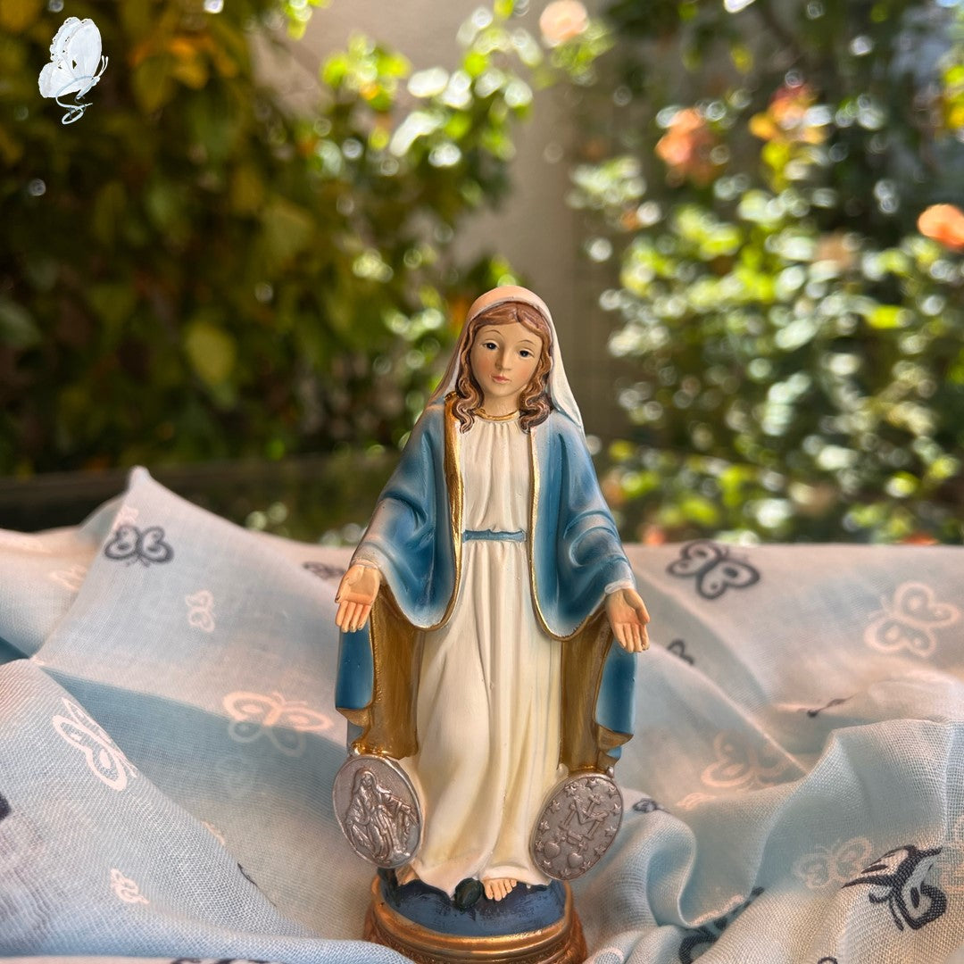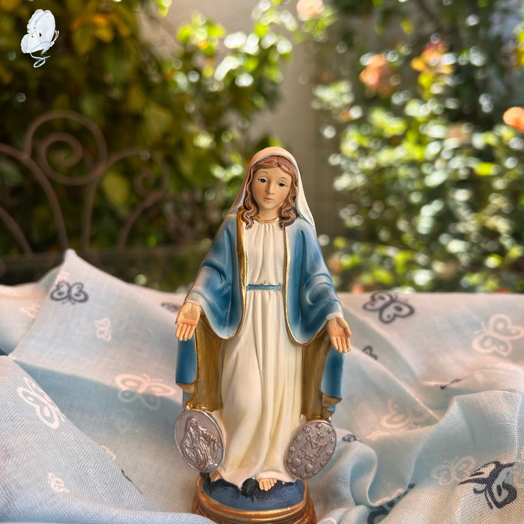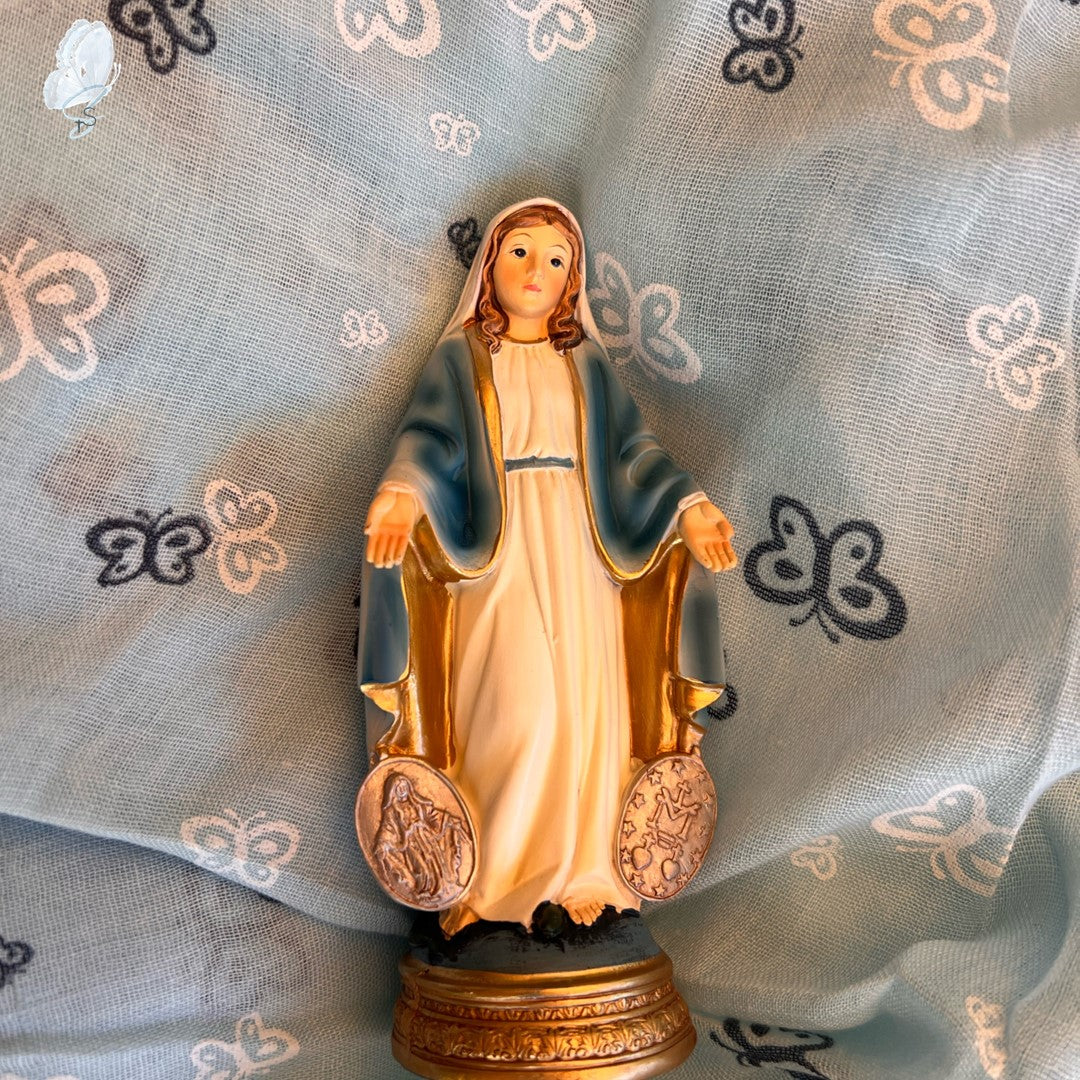 This beautifully crafted Miraculous Medal Mary Statue is made of resin and hand-painted with exquisite detail. Inspired by traditional Italian design, it is part of the exclusive Renaissance Collection, showcasing the artistry of Italian craftsmen. Measuring 12.5cm high, this statue is available in two variations—one featuring impressions of the front and back of the Miraculous Medal, and the other without.