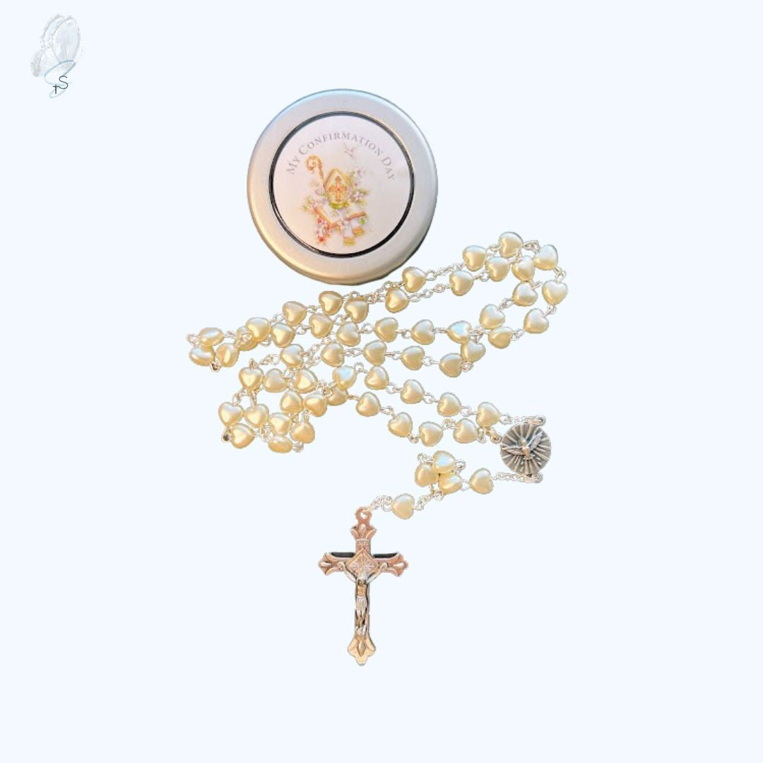 Pearly White Heart Confirmation Rosary with Dove and Crucifix