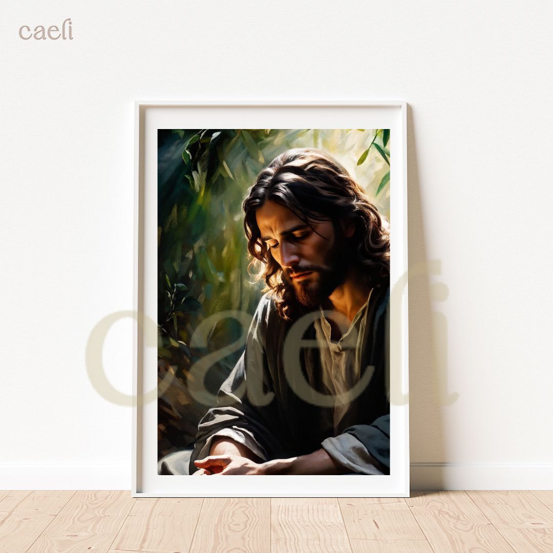 Pie Jesu (Latin for “Merciful Jesus”) captures a moment of profound stillness and divine intimacy — Jesus in quiet prayer, surrounded by the serenity of a garden.