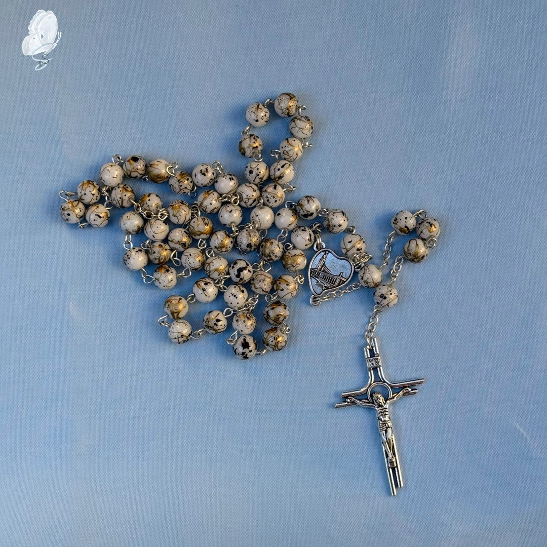 This elegant rosary, sourced from the official store in Fatima, Portugal, features white glass beads accented with intricate gold and black markings that resemble artistic paint splatters. The result is a beautiful and distinctive devotional item.