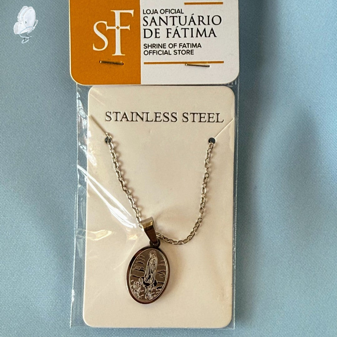 This finely detailed stainless steel medal features a laser-engraved image of Our Lady of Fatima appearing to the three shepherd children. Measuring 1.7cm x 1.2cm, it comes on a matching chain and is lightweight yet durable—ideal for everyday wear or as a keepsake of devotion. Sourced from the official store at the Shrine of Our Lady of Fatima in Portugal.