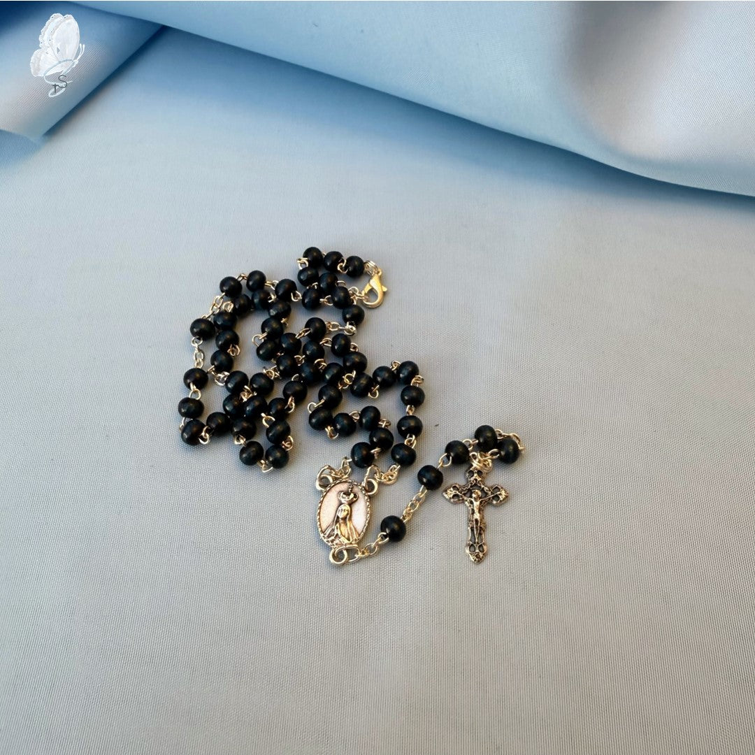 A dainty rosary with smooth navy blue beads, featuring a detailed small silver crucifix (2 cm). The centrepiece depicts Our Lady on one side and Our Lady of Fatima with the shepherd children on the other. Includes a clasp to wear as a necklace. Length: 33 cm.