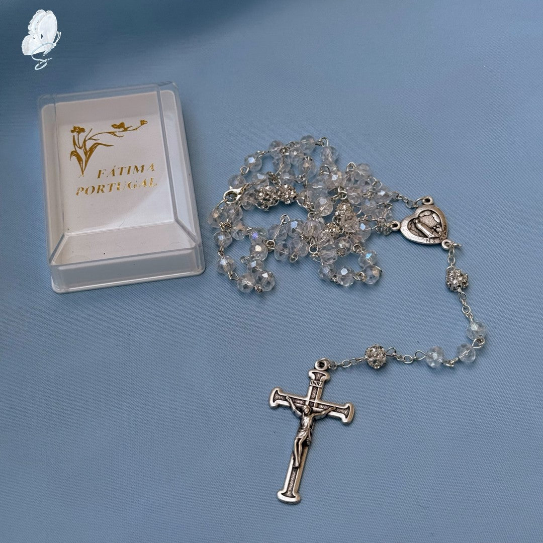 An exquisite rosary sourced from Fatima, Portugal, featuring clear crystal-like beads that reflect light beautifully. Each decade is marked with textured silvery beads, adding a unique and elegant touch. The simple silver-toned crucifix pairs perfectly with the silver heart-shaped centrepiece depicting Our Lady of Fatima.