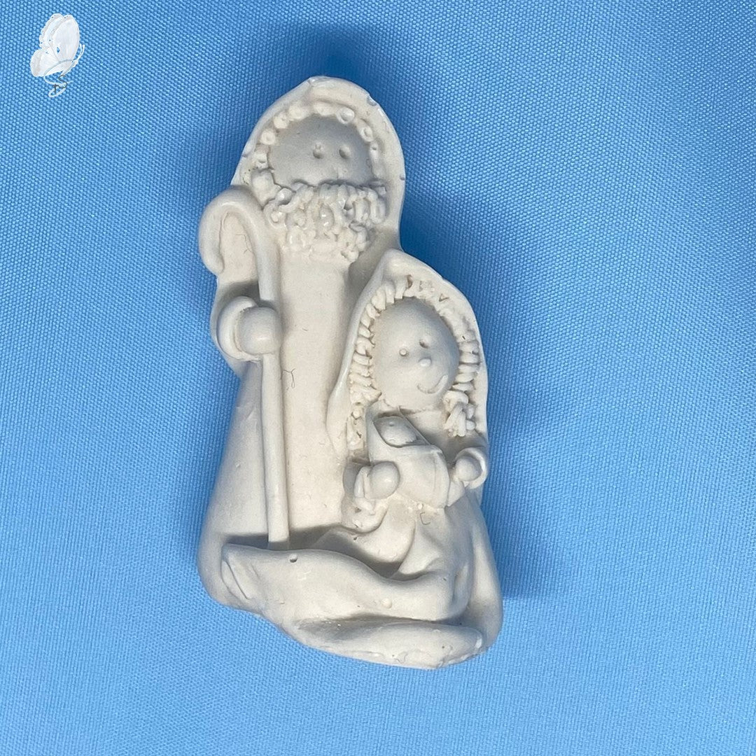 This dainty piece depicts Joseph standing beside a kneeling Mary, who lovingly cradles the infant Jesus in her arms. Measuring approximately 2.5 cm x 6.5 cm x 4 cm, it captures a moment of devotion and gentle care within the Holy Family.