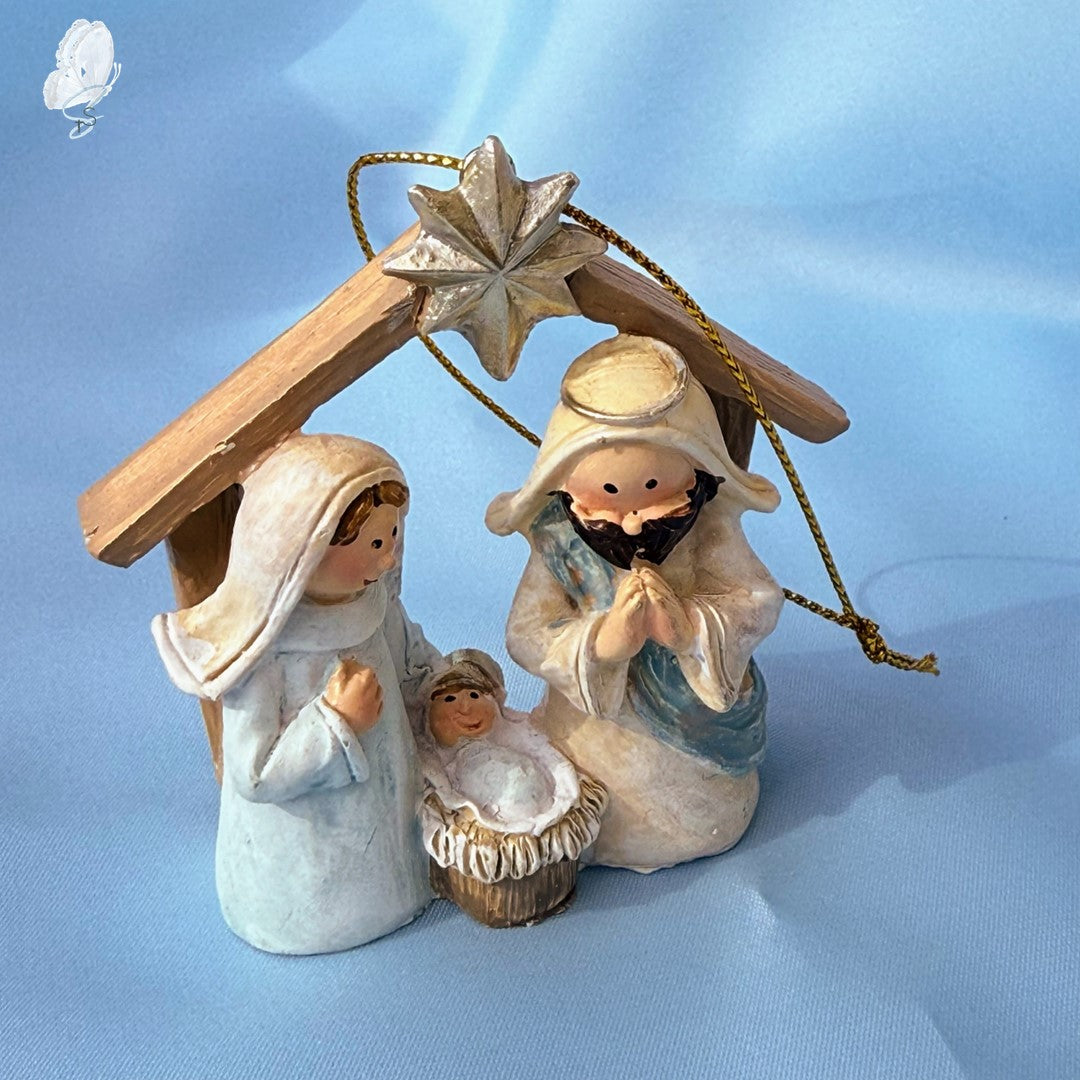 Sourced from Madeira, Portugal, this beautiful resin Christmas tree decoration shows the Holy Family in a stable under a shining star. Joseph and Mary stand over the manger with baby Jesus, dressed in soft cream and pale blue tones. Measuring approximately 7 × 7 cm, this delicate ornament adds a gentle touch of faith to your Christmas celebrations.