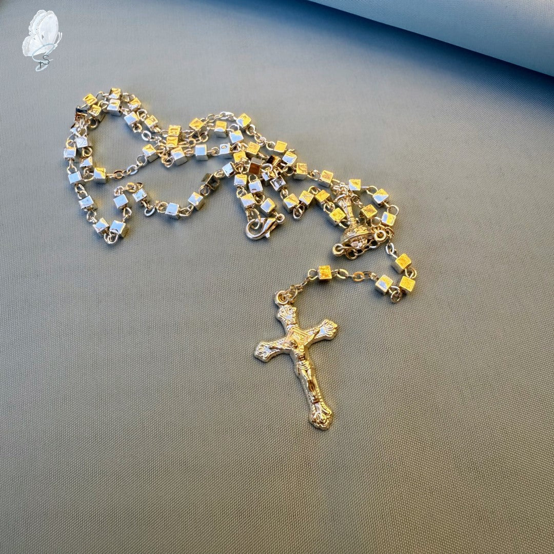 Portugal Drop: Rosary Necklace with Square Silver-Toned Beads