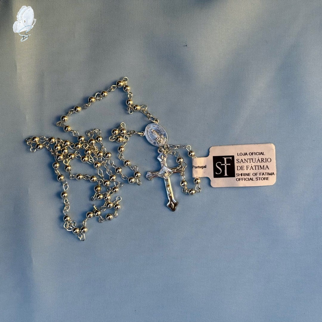 Sourced from the official store in Fatima, Portugal, this 41 cm silver-tone rosary is a reverent keepsake that blends beauty and devotion. The centrepiece features an image of Our Lady of Fatima, and on the reverse, it holds sacred sand from the Shrine of Fatima—a powerful reminder of this holy place.