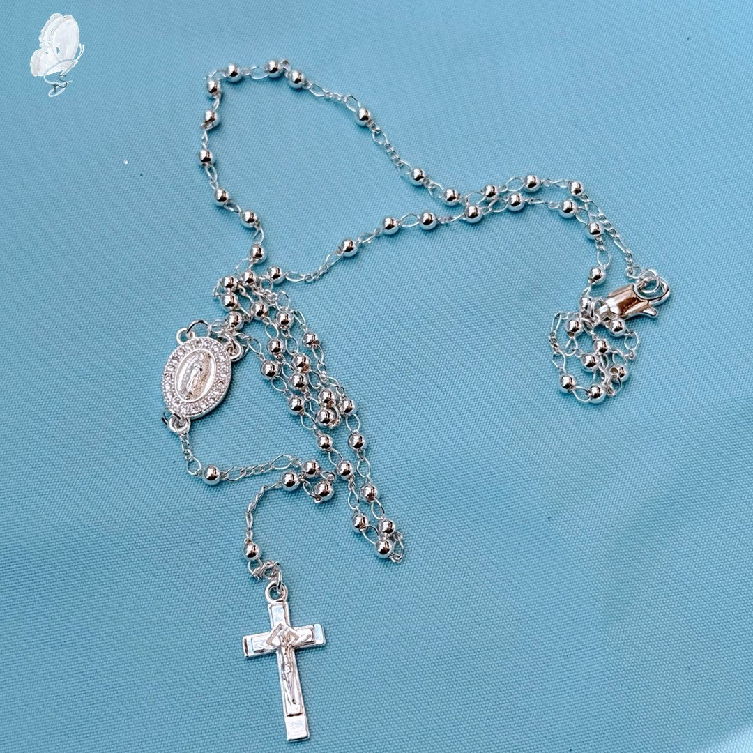 Sourced from Madeira, Portugal, this elegant rosary necklace features a light silver-toned chain, beads, and a detailed crucifix (2 cm × 1.1 cm), with a centrepiece depicting Our Lady. Designed as a refined expression of faith, it includes an adjustable extension chain and lobster clasp for added comfort.