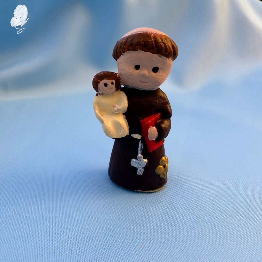 This unique 5.5 cm resin statue of St Anthony is a one-of-a-kind devotional piece, handmade by an artisan atelier in Madeira, Portugal. It depicts St Anthony holding the Infant Jesus and a red Bible, with delicate flowers adorning the hem of his habit. The statue is mounted on a felted base to prevent slipping and protect surfaces.