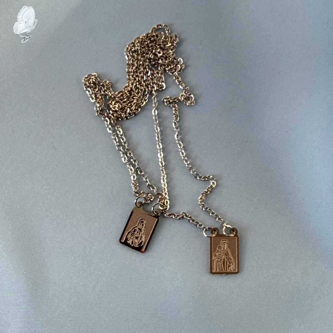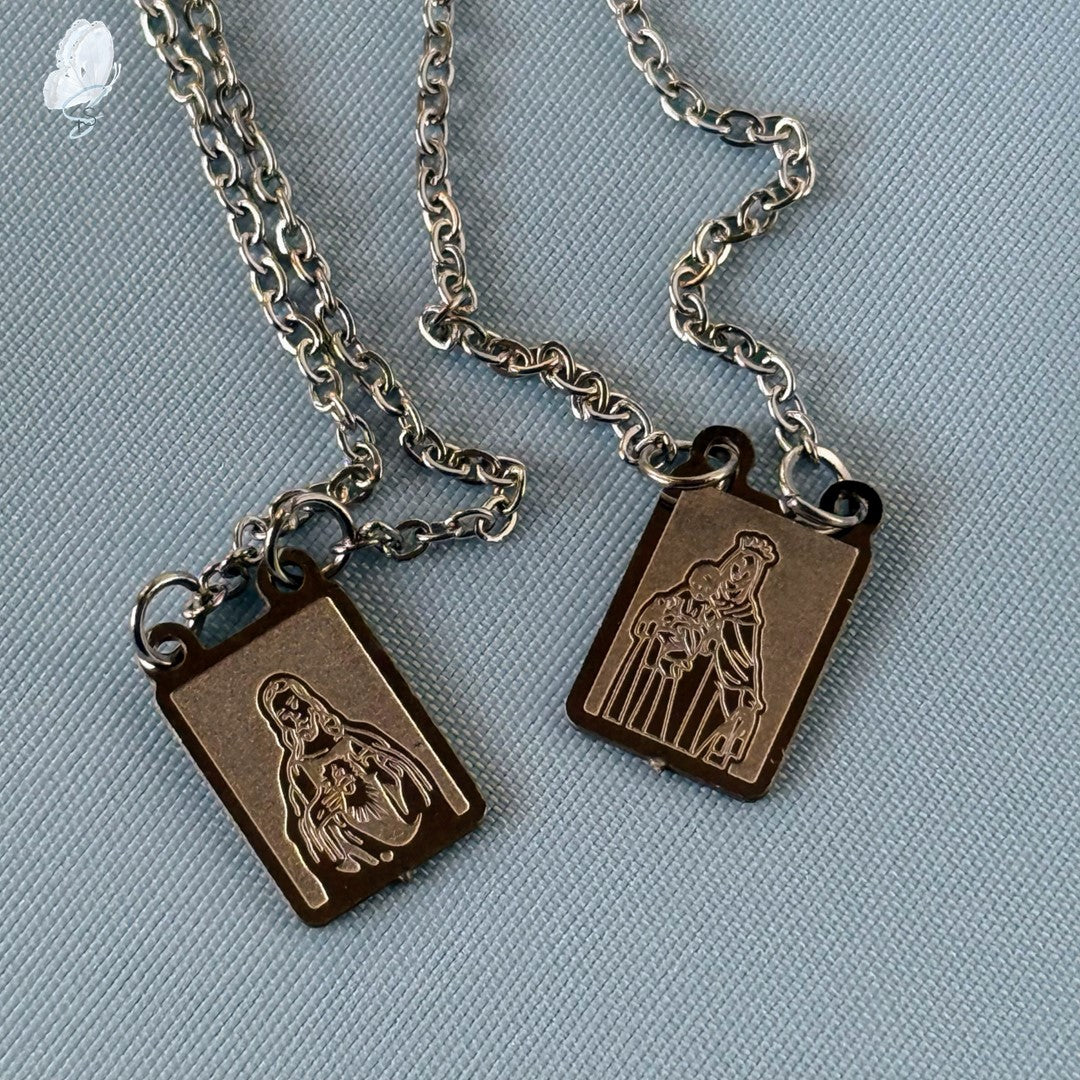 This stainless steel scapular necklace was sourced near the Shrine of Our Lady of Fatima in Portugal. It features two devotional medals, each measuring 1.2cm x 0.9cm, joined by a 69cm chain, so that one rests on the chest and the other on the back when worn, in keeping with traditional scapular practice.