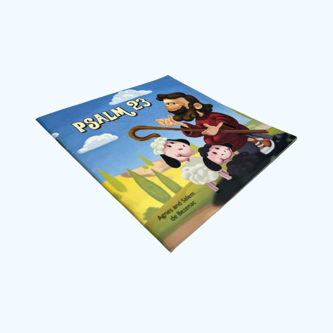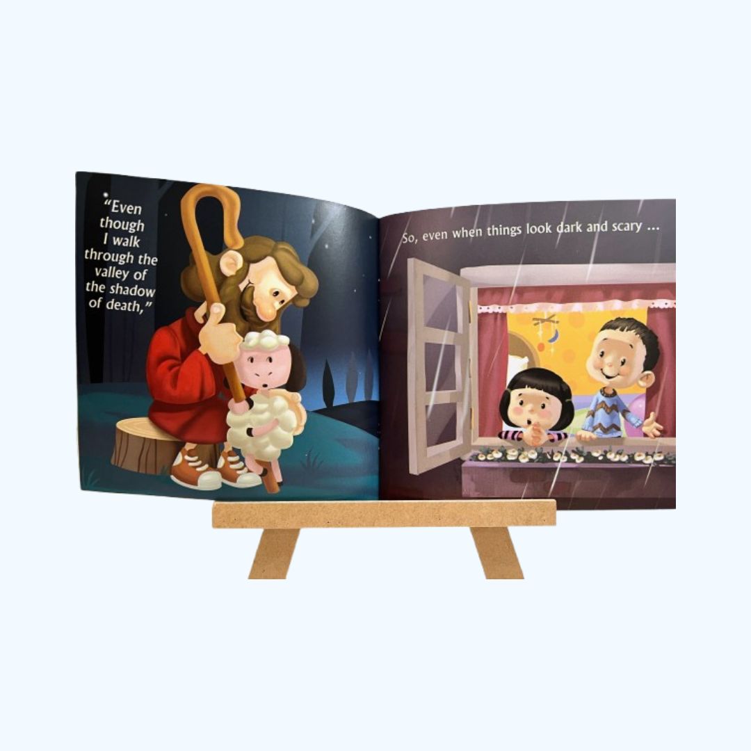 The original Psalm, alongside a paraphrased verse and illustration, makes this well-known passage relatable to children.