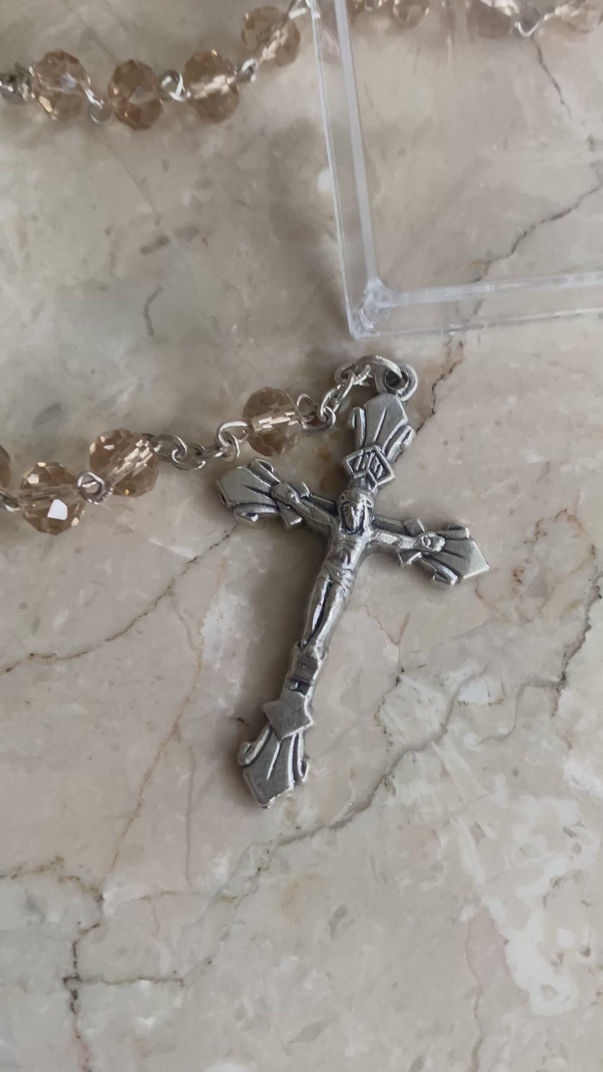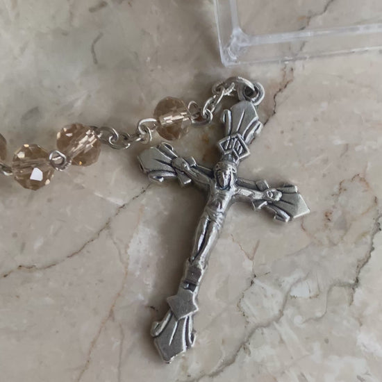 The soft peach-coloured beads give it a gentle, graceful appearance - subtle yet beautifully unique. Paired with classic silver-tone findings, the rosary maintains a traditional look while offering a touch of modern colour. Smooth to hold and easy to pray with, it’s perfect for daily devotion, personal prayer spaces, or as a thoughtful Catholic gift.