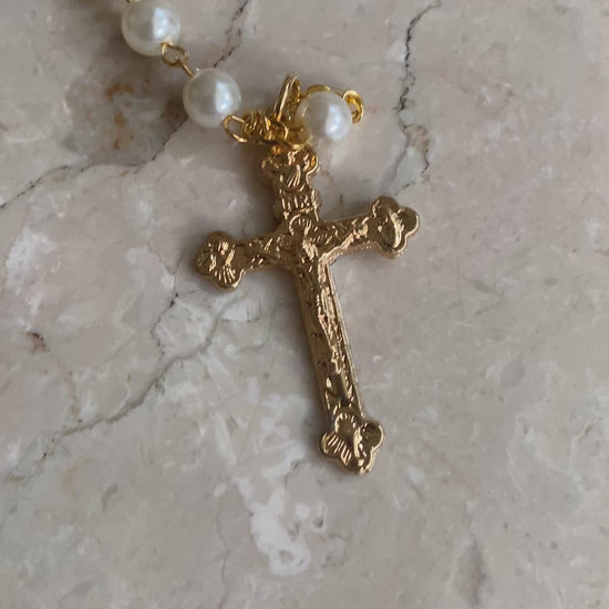 Measuring approximately 46 cm from top to bottom, it has a comfortable, compact length - ideal for daily use, carrying in a handbag, or keeping beside your bed or prayer space. The warm gold details complement the soft sheen of the pearls, giving the rosary a traditional yet luxurious look.