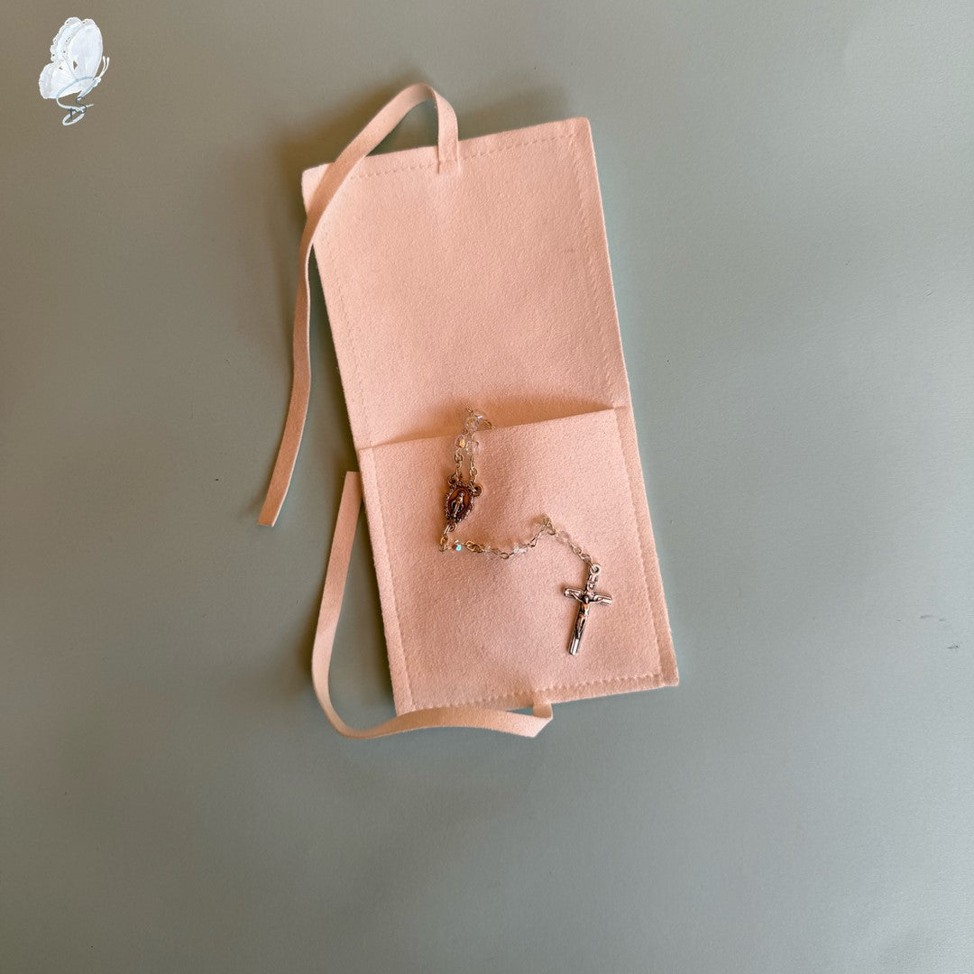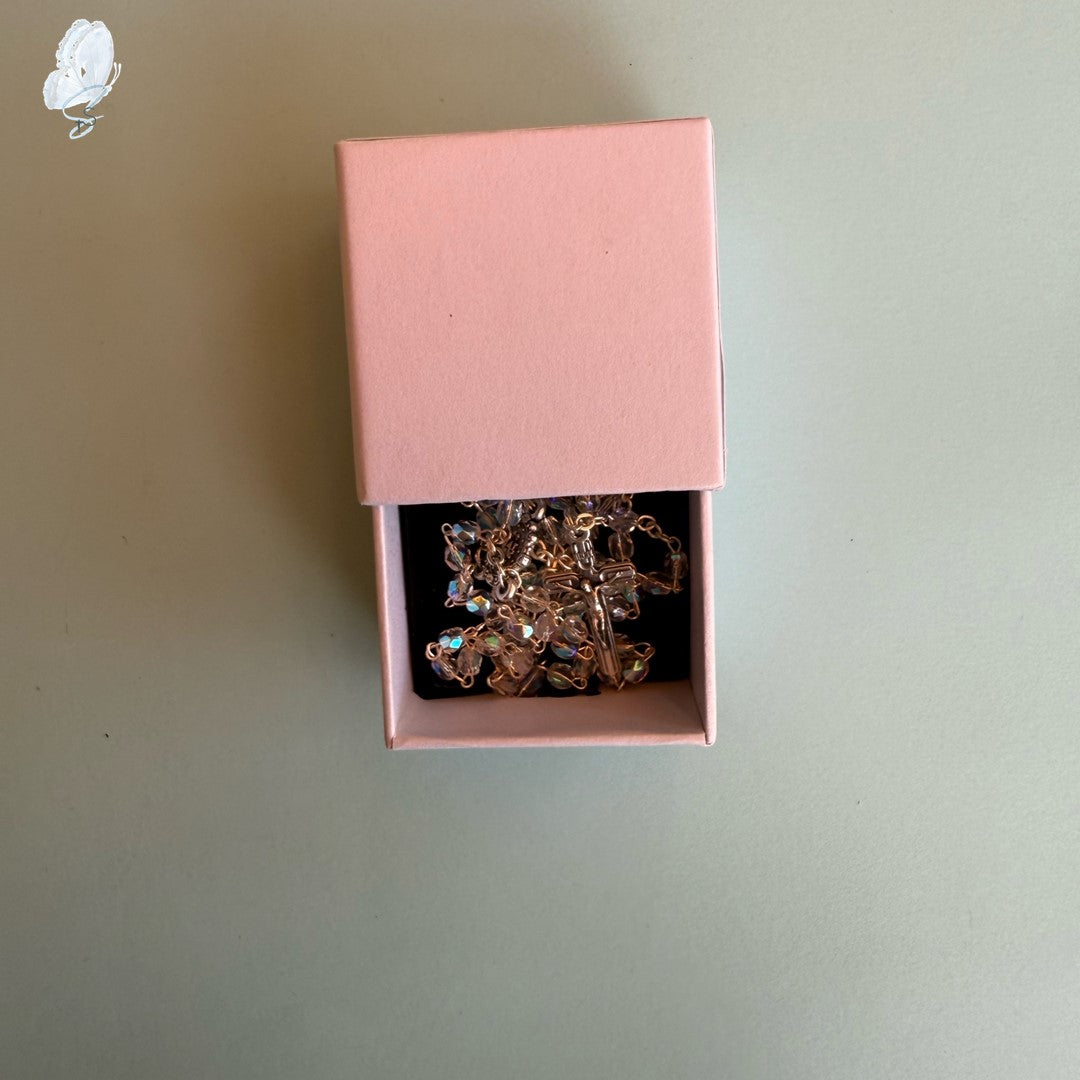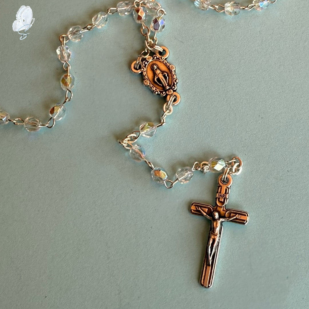 This delicate rosary necklace features shimmering crystal beads that catch the light beautifully, creating an elegant, dainty appearance. Measuring approximately 38 cm in length, it includes a Miraculous Medal and a simple crucifix, making it a perfect choice for prayer, devotion, or as a thoughtful gift for loved ones.