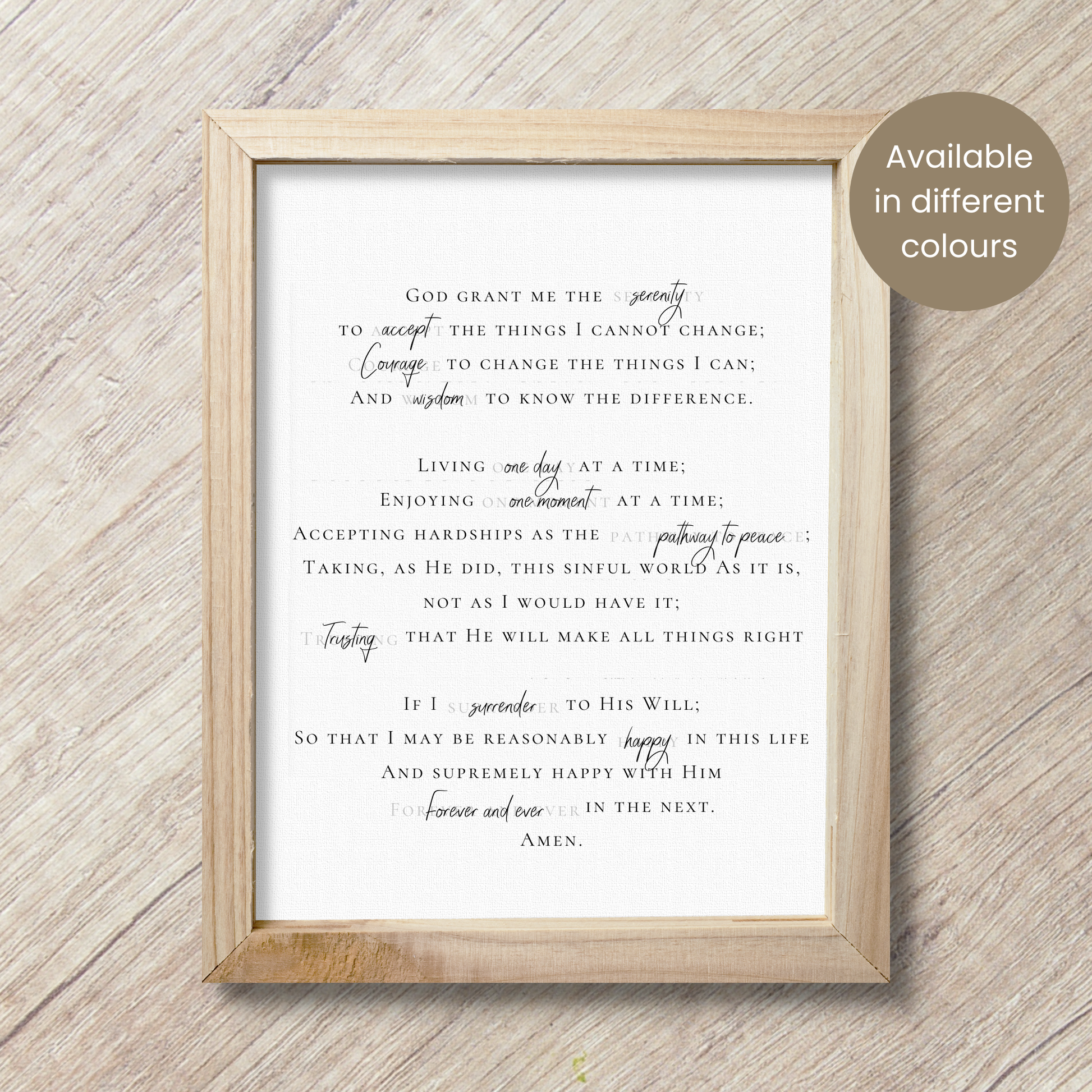 Serenity Prayer (Long Version) wall art perfect for your home or to use as a prayer card. Available in 10 different colours.