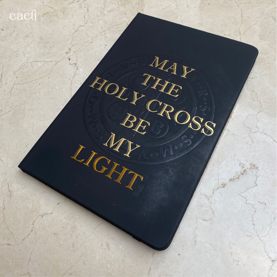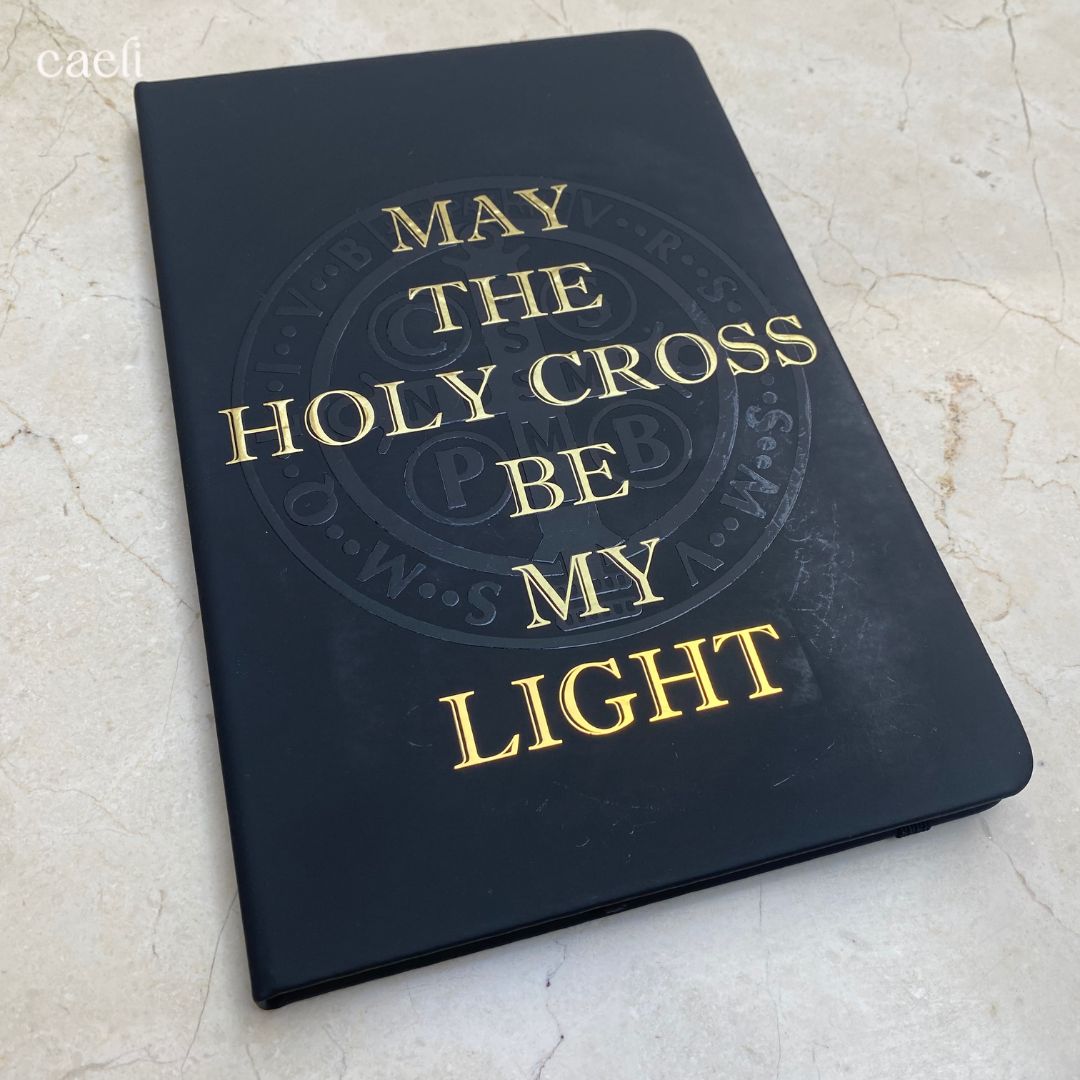 Our striking A5 Notebook features the powerful phrase "May the Holy Cross be my Light", paired with a St. Benedict Medal on a deep black background—symbolising spiritual protection, strength, and unwavering faith. Inspired by St. Benedict, the father of Western monasticism, this compact notebook is perfect for journaling, prayers, and daily reflection.