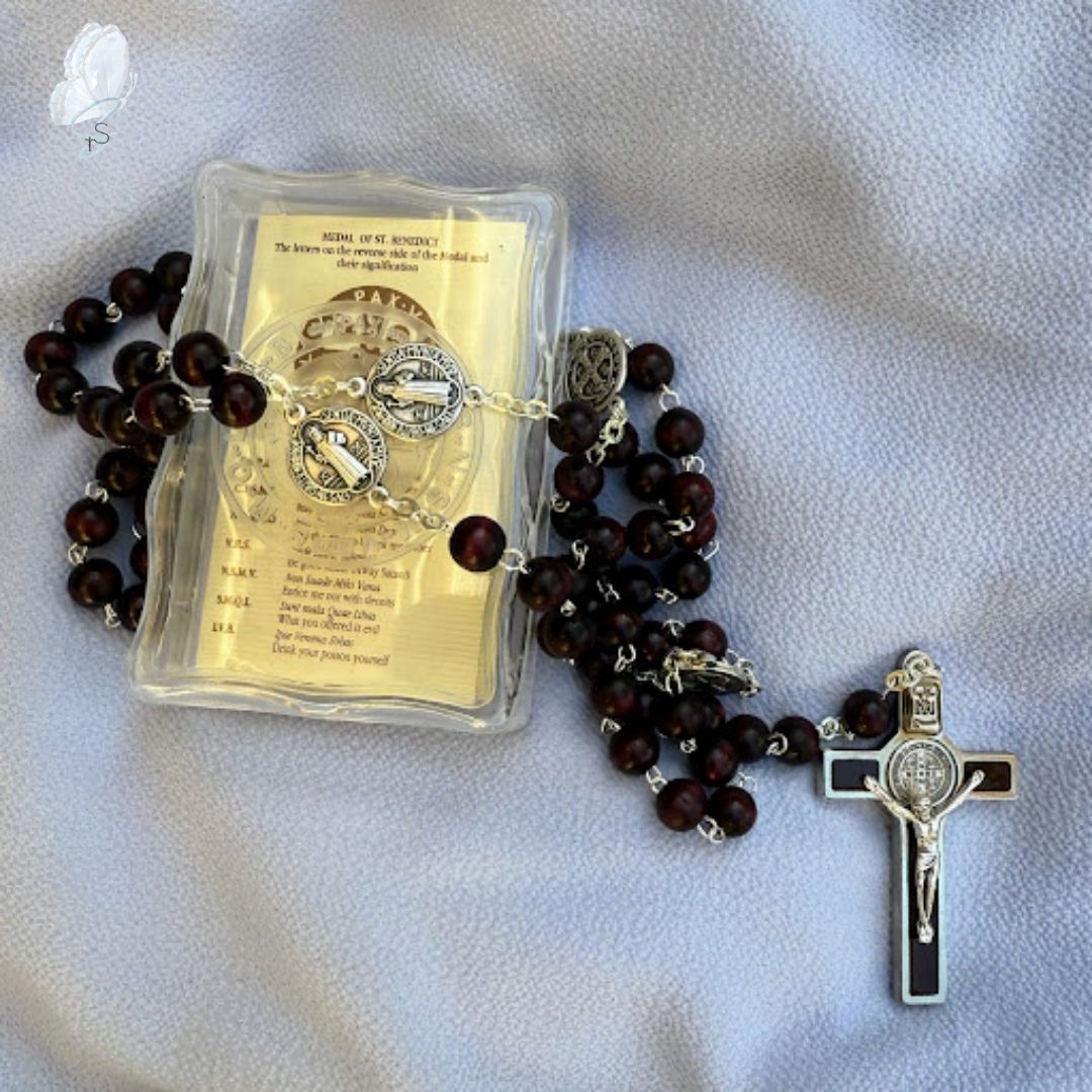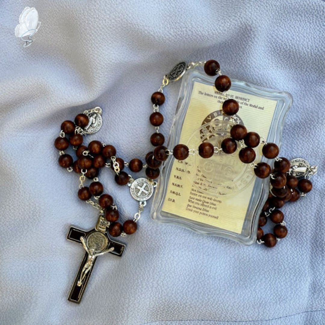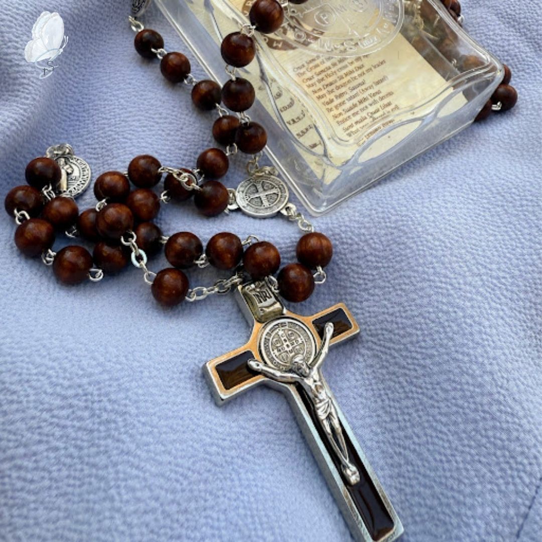 This St. Benedict wooden rosary is a powerful sacramental, combining natural wooden beads with silver-toned St. Benedict medals as the centrepiece and decade markers. The round 7mm beads are smooth and lightweight, making them comfortable for prayer. The rosary features a striking 5cm x 3.2cm St. Benedict crucifix in brown and silver, adding to its timeless design.