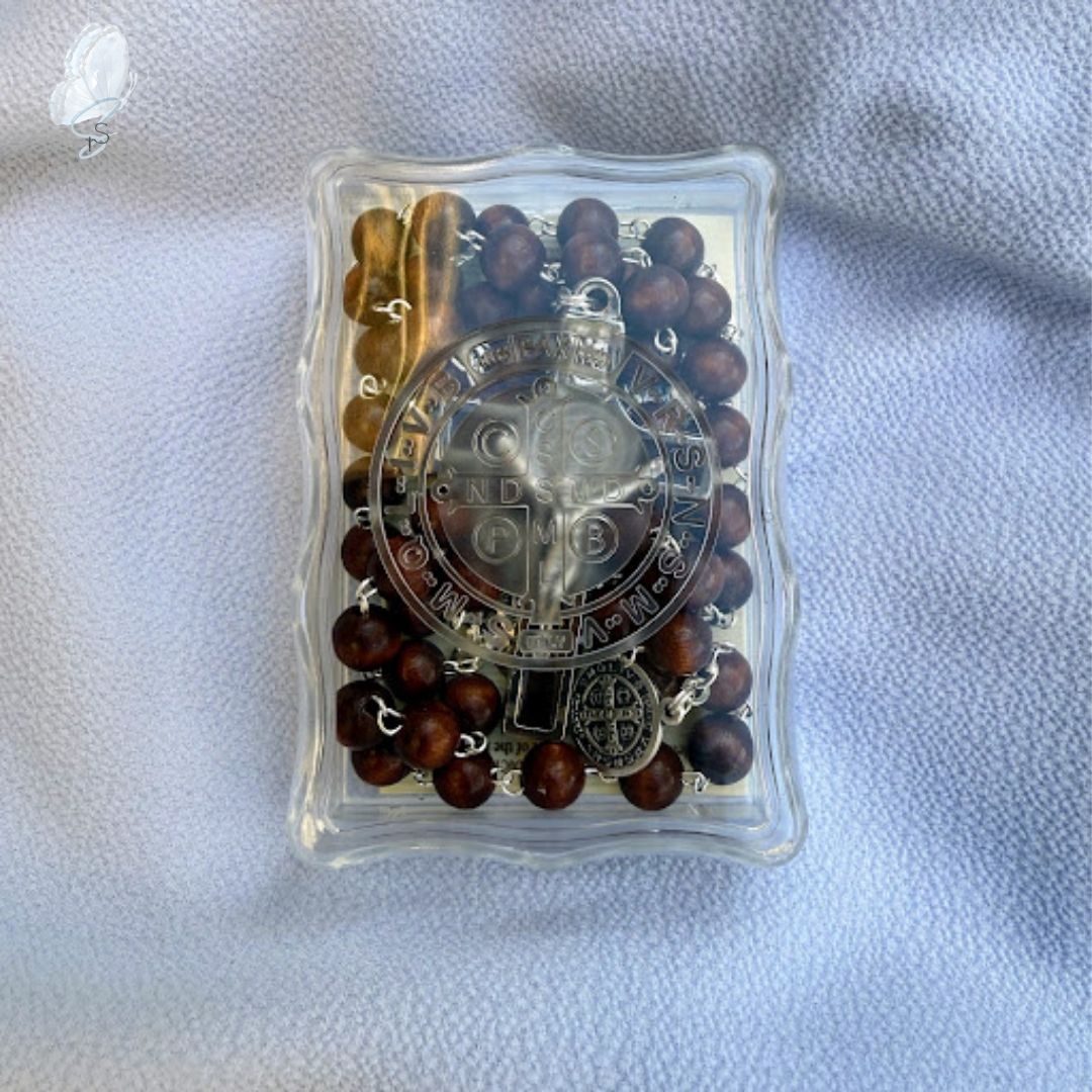 St Benedict Wooden Rosary in Embossed Perspex Box | Personalisation Available