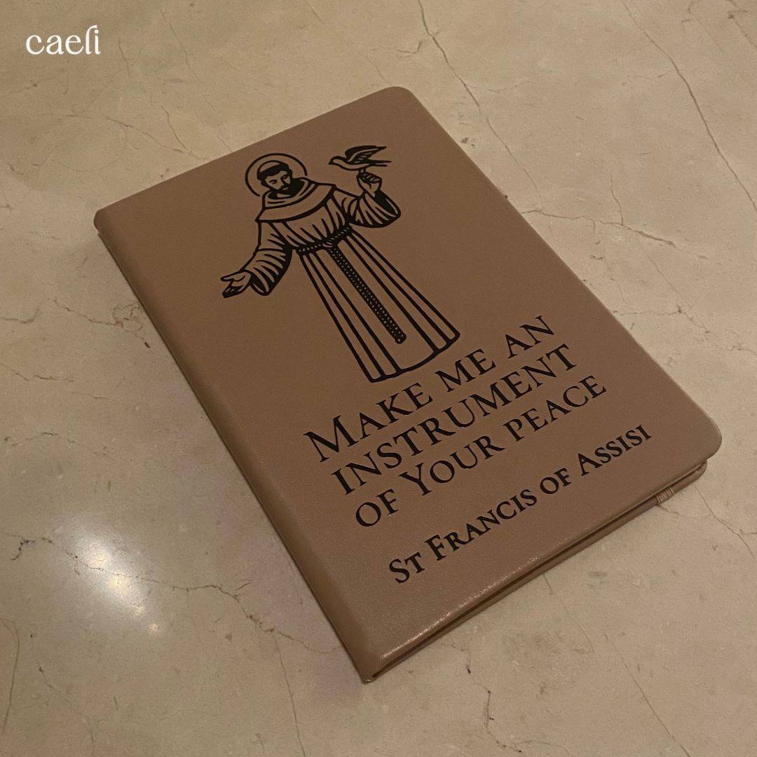 Our elegant A5 Notebook, beautifully inscribed with the powerful quote from St Francis of Assisi "Make me an instrument of Your peace." This compact notebook is perfect for journaling, prayers, and reflections, with its luxurious cover serving as a daily reminder of your faith. Ideal for gifting or personal use, it’s a stylish and meaningful addition to your spiritual journey.