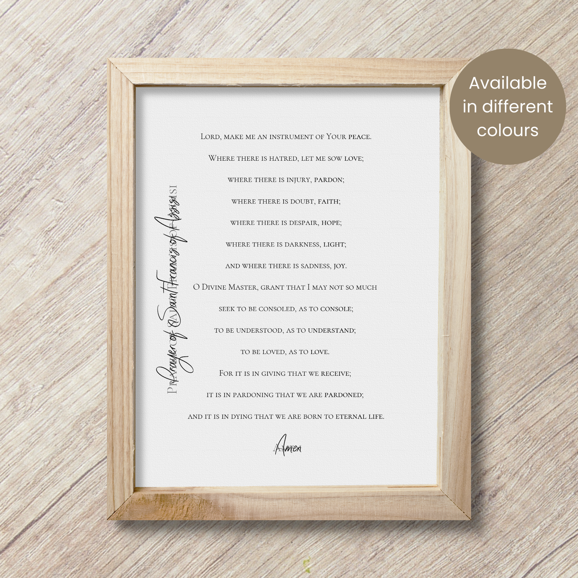 Beautiful St. Francis of Assisi prayer wall art perfect for your home or to use as a prayer card. Available in 9 different colours.