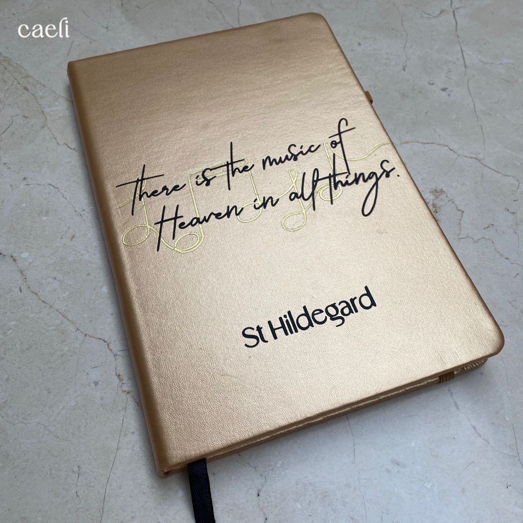 Our elegant A5 Notebook, beautifully inscribed with the St Hildegard quote "There is the music of Heaven in all things" This compact notebook is perfect for journaling, prayers, and reflections, with its luxurious cover serving as a reminder to surrender to God's will daily. Ideal for gifting or personal use, it’s a stylish and meaningful addition to your spiritual journey.