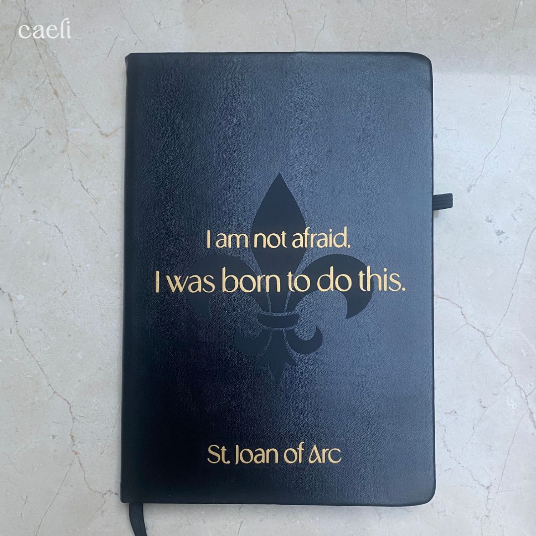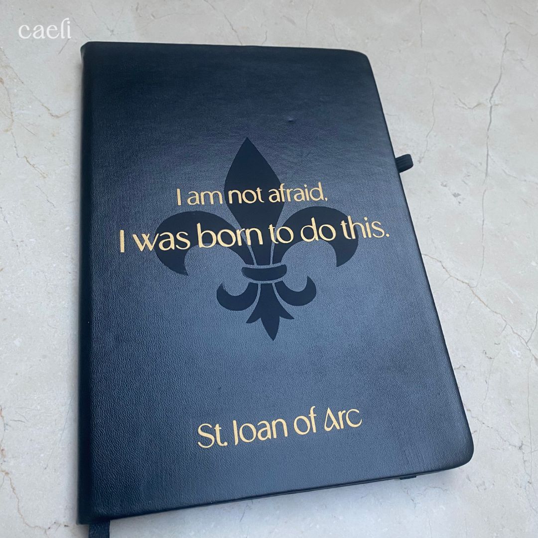 Our elegant A5 Notebook, beautifully inscribed with the powerful quote from St. Joan of Arc "I am not afraid. I was born to do this." imprinted on a Fleur de Lille. This compact notebook is perfect for journaling, prayers, and reflections, with its luxurious cover serving as a daily reminder of your faith. Ideal for gifting or personal use, it’s a stylish and meaningful addition to your spiritual journey.