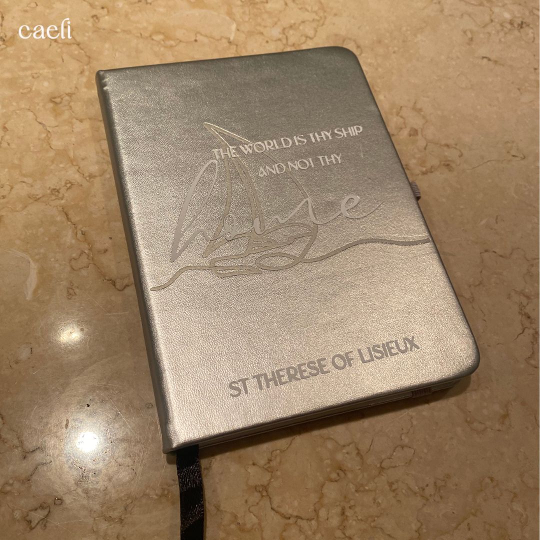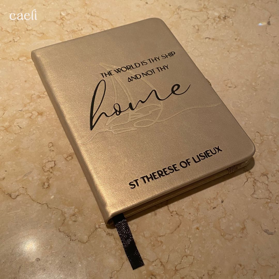 Our elegant A5 Notebook, beautifully inscribed with the powerful quote from St. Thérèse of Lisieux "The world's thy ship and not thy home." This compact notebook is perfect for journaling, prayers, and reflections, with its luxurious cover serving as a daily reminder of your faith. Ideal for gifting or personal use, it’s a stylish and meaningful addition to your spiritual journey.