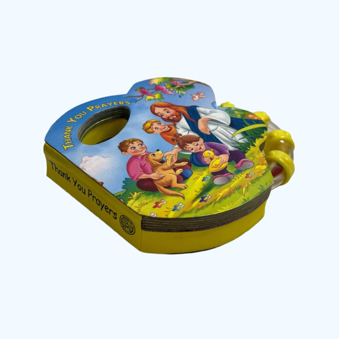 This prayer book is adorned with beautiful illustrations and features a built-in rattle. The thick cardboard pages are durable and long-lasting.