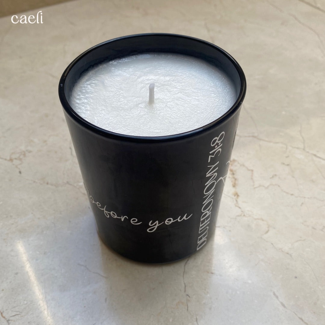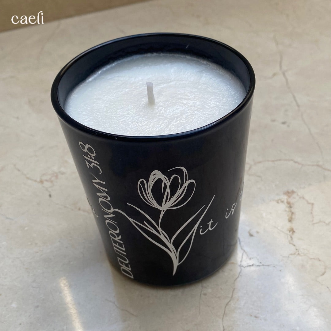 Step forward in faith with the Follow Me candle, a gentle reminder that you never walk alone. Infused with a refreshing scent, this candle offers peace and encouragement for uncertain days. Housed in a sleek black glass jar, the candle features a simple tulip design paired with the comforting words: "It is the Lord who goes before you." - a powerful promise from Deuteronomy 31:8.