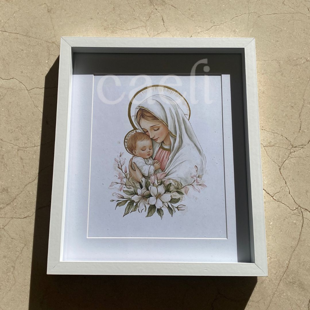 - Sacred Design: Features Mary and Baby Jesus with delicate pink and white accents