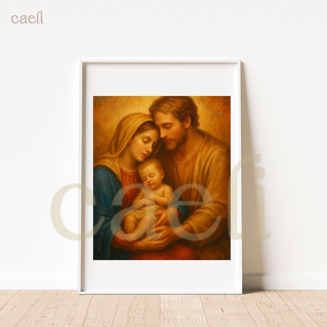 This tender artwork of the Holy Family embracing captures the beauty of love, unity, and divine peace within the heart of the home. With Mary and Joseph gently wrapped around the Christ Child, this piece radiates warmth and reverence — a perfect reflection of trust, protection, and God’s presence in family life.