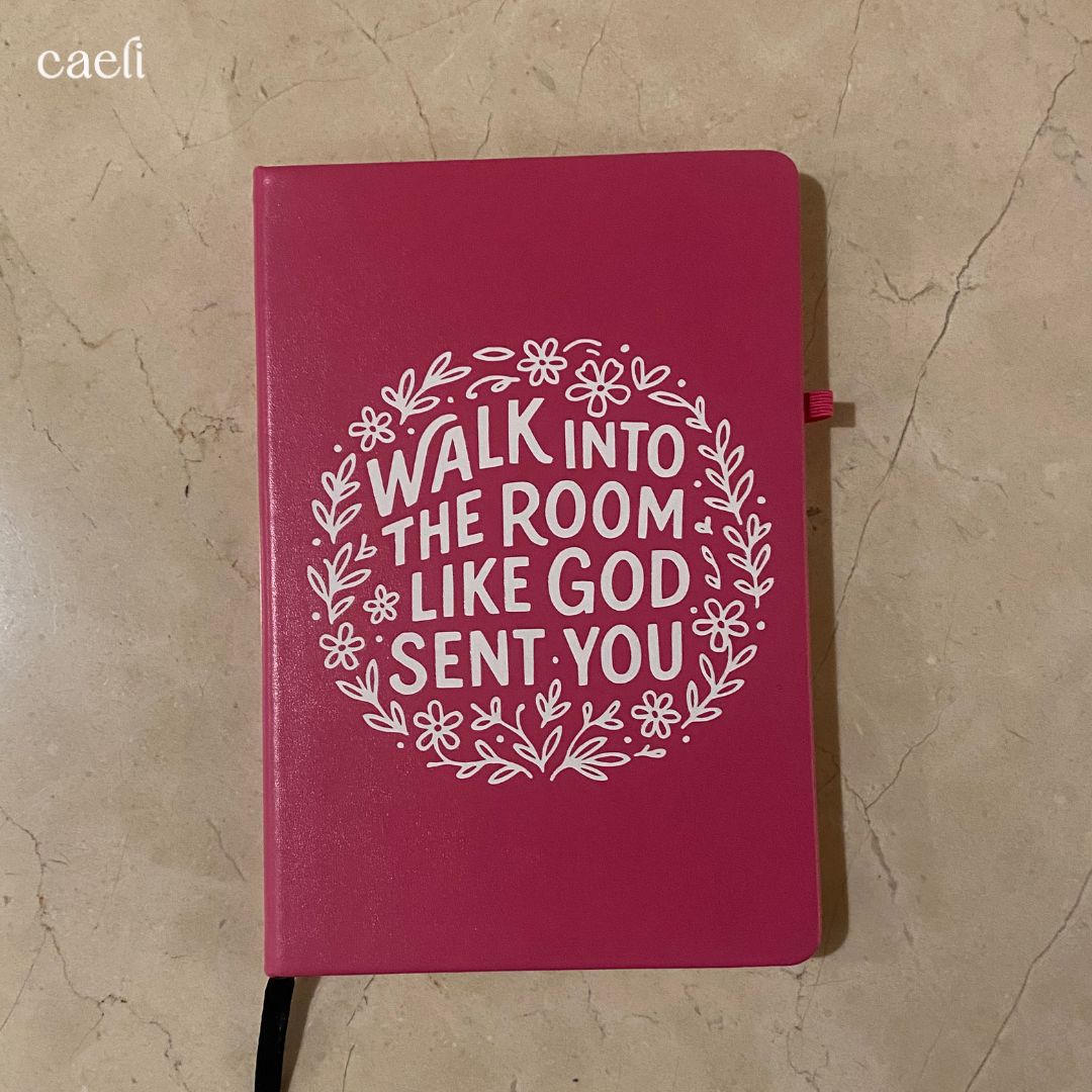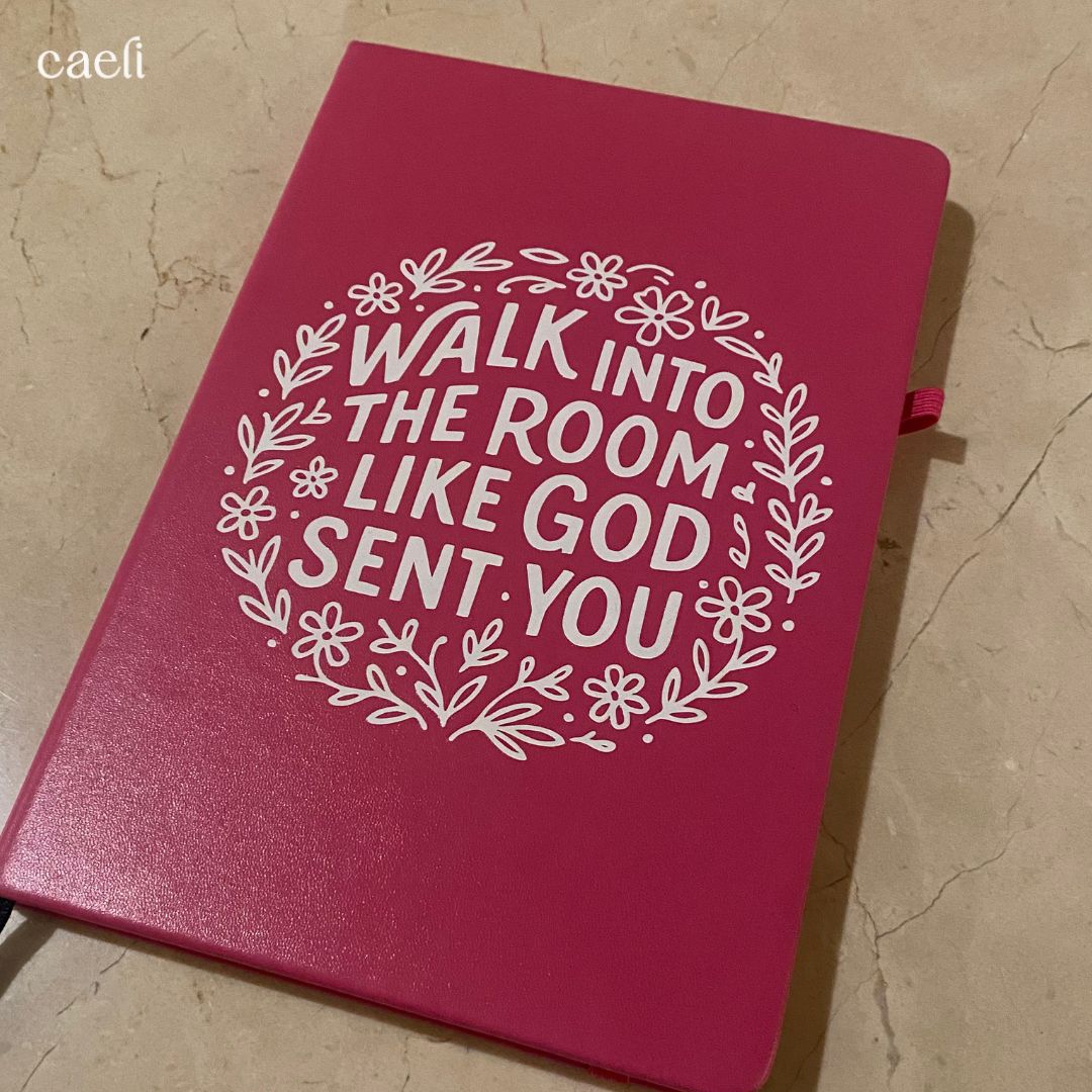 Step confidently into your day with our elegant A5 notebook, featuring the empowering phrase: "Walk into the room like God sent you." This compact and stylish notebook is perfect for journaling, prayer, planning, or reflection—designed to inspire boldness, purpose, and faith in every moment.