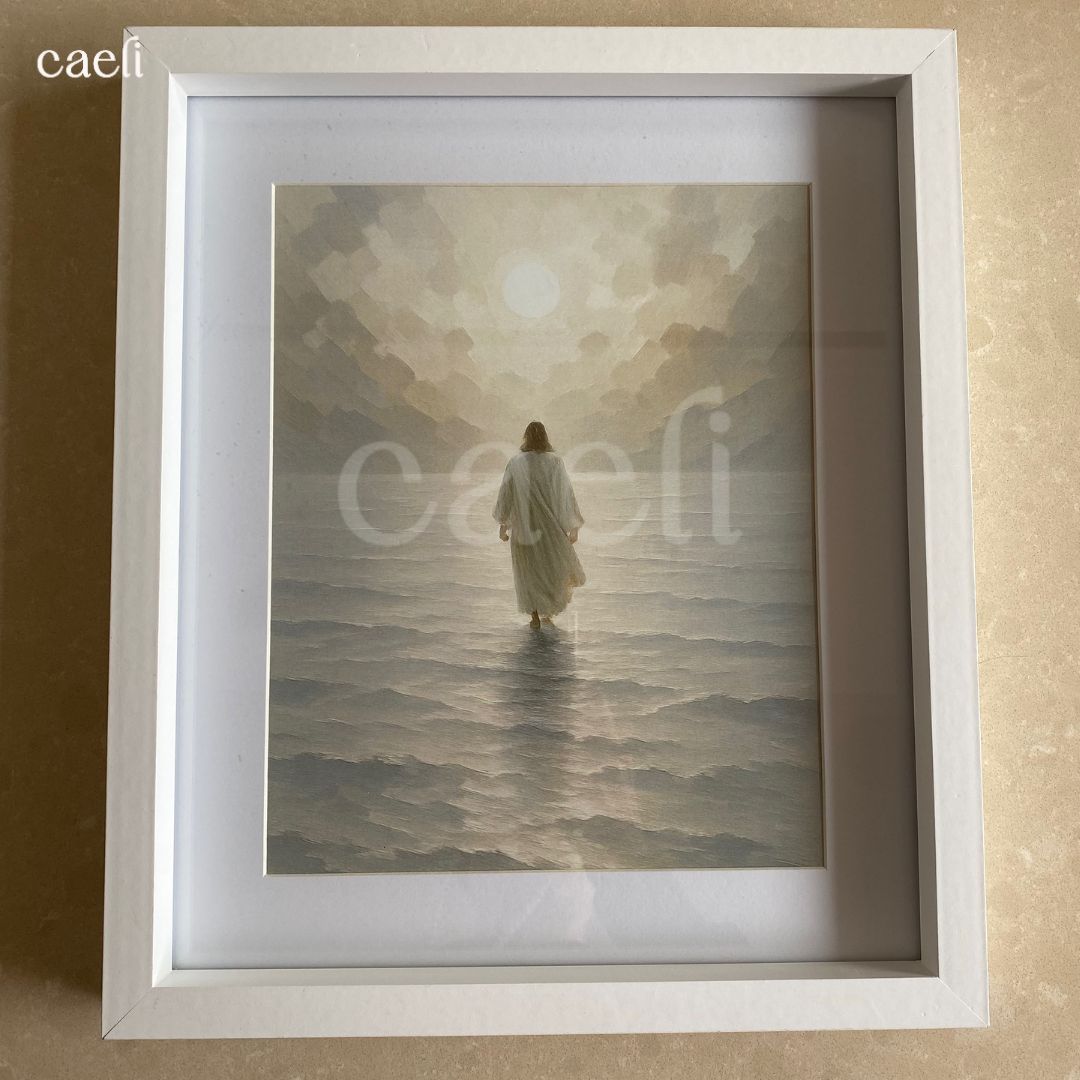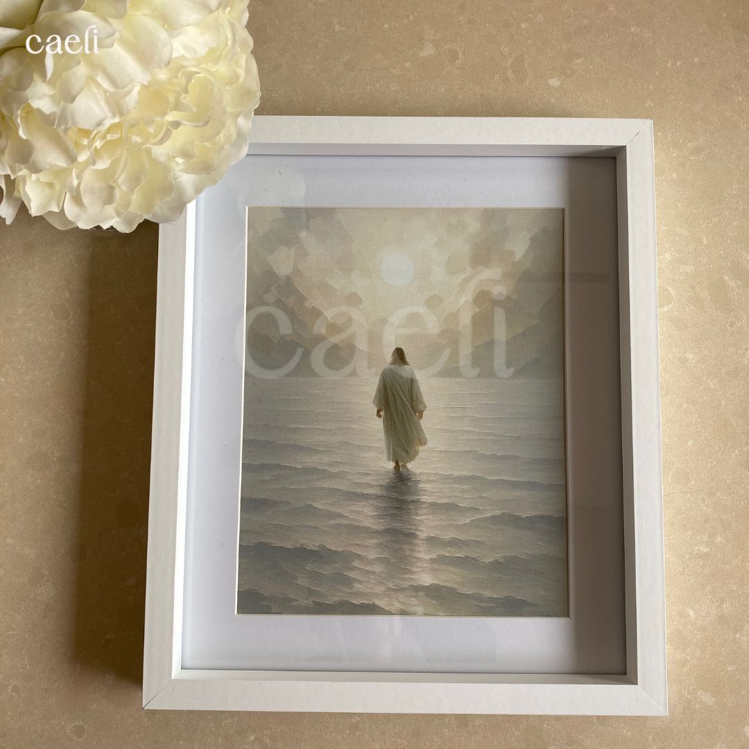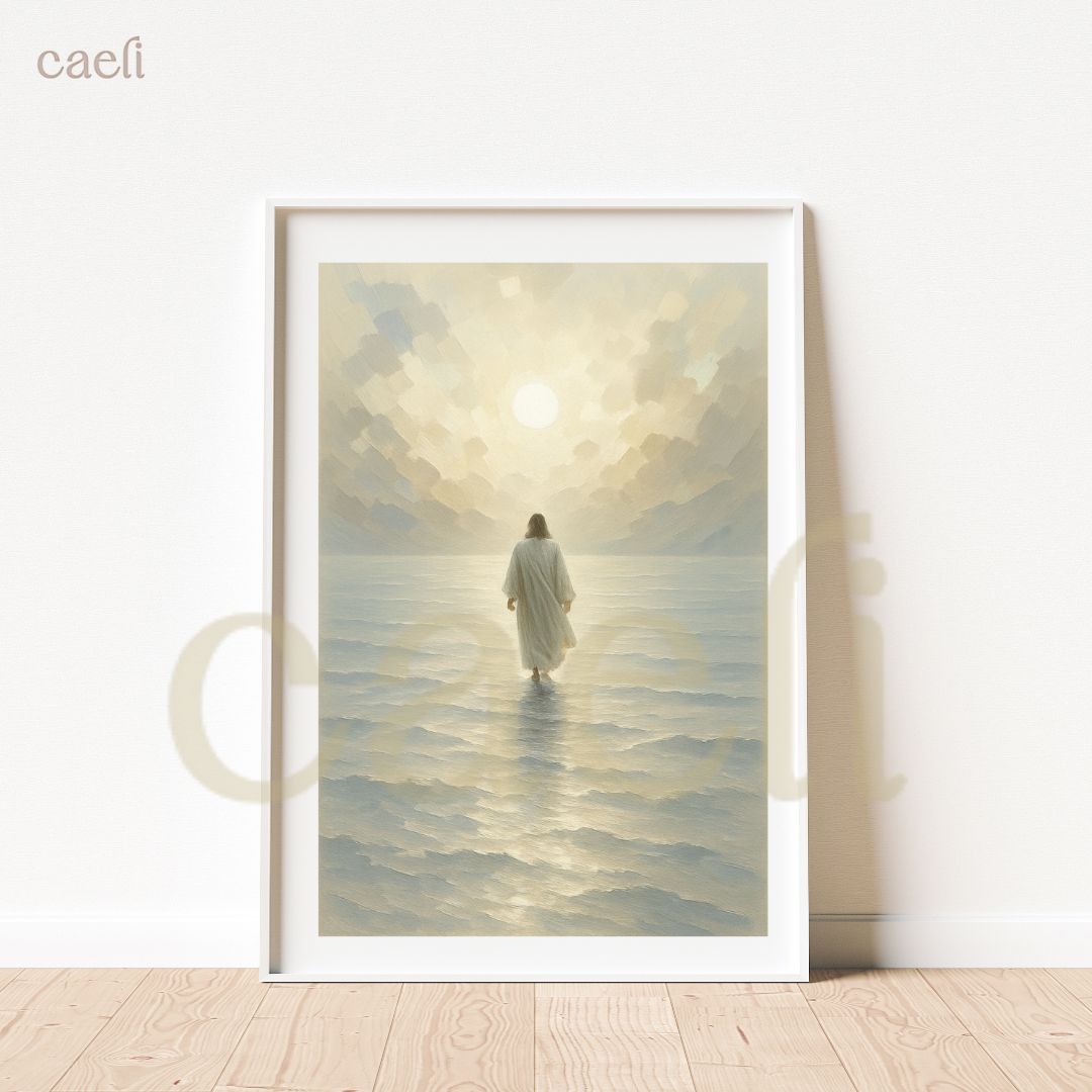 Experience the powerful moment of faith and divine reassurance with this stunning artwork of Jesus walking on water. Inspired by the miracle where Christ calms the storm and calls Peter to step out in faith, this piece captures the serenity and strength of the Savior amidst the chaos of the sea.