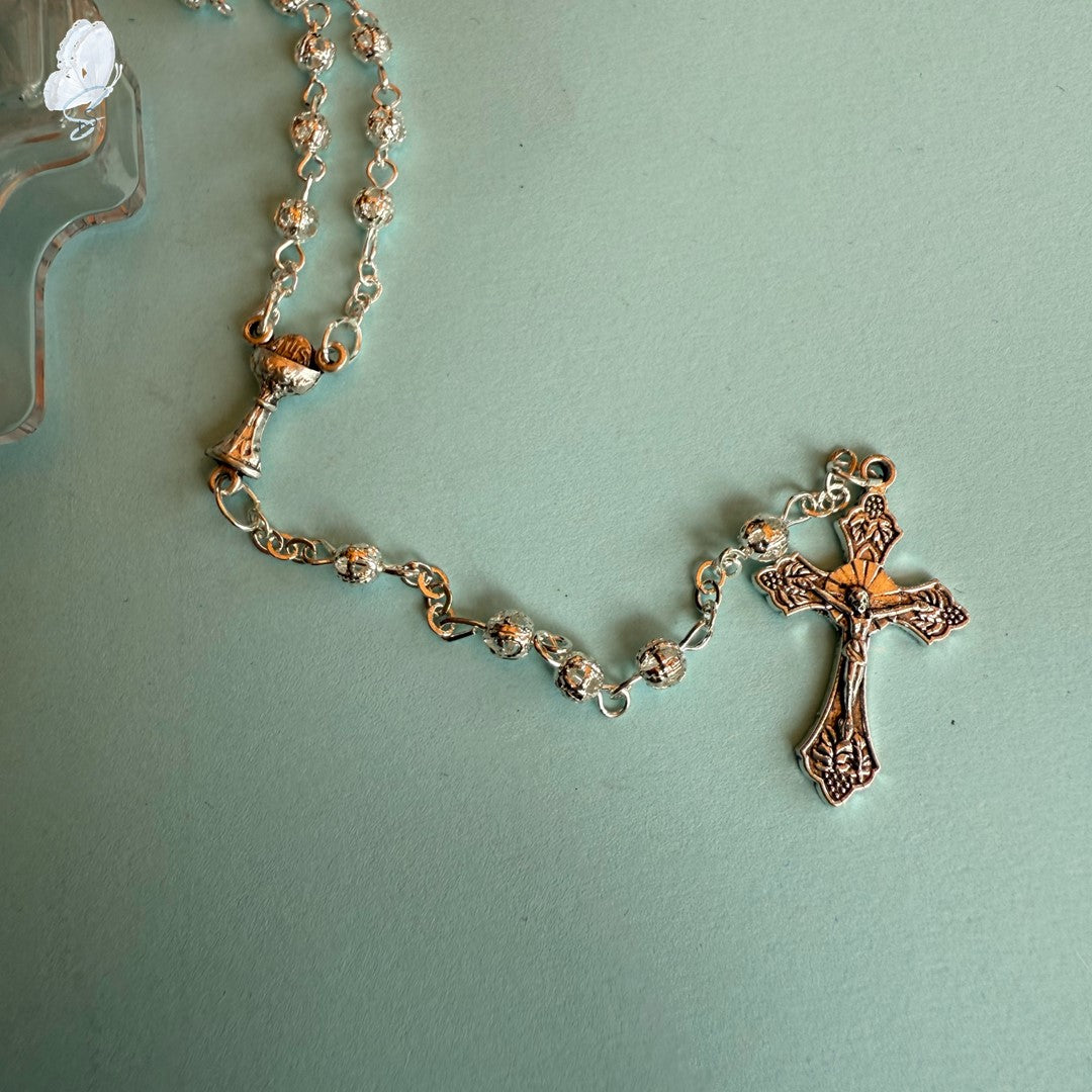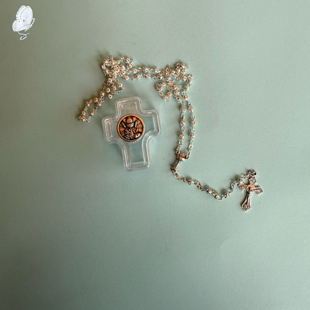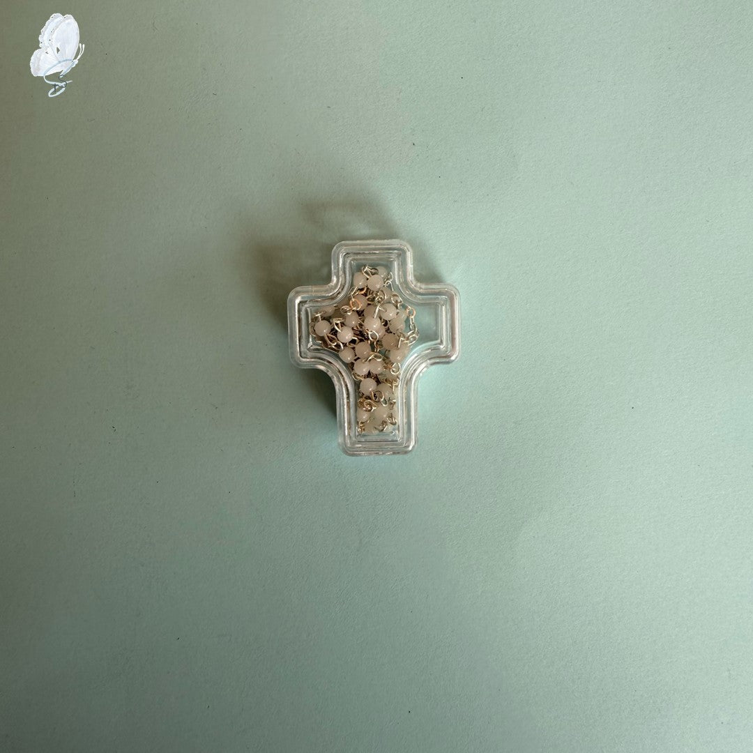 This delicate rosary features tiny 4mm beads, creating a refined and graceful design. The detailed crucifix adds a meaningful touch, making it perfect for prayer and devotion. Measuring 36 cm in length, this rosary comes beautifully presented in a clear, cross-shaped box—ideal for gifting or safekeeping.
